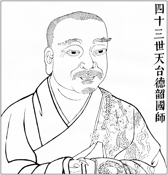 天台山德韶国师,清凉文益禅师之法嗣,俗姓陈,处州(今浙江丽水)龙泉人。其母叶氏,曾梦见白光触体,因而有孕。德韶禅师十五岁时,曾有一梵僧来家中化缘,见他生得气度不凡,便劝他出家。于是他十七岁便依本州龙归寺落发,十八岁又于信州(治所在今江西上饶)开元寺受具足戒。