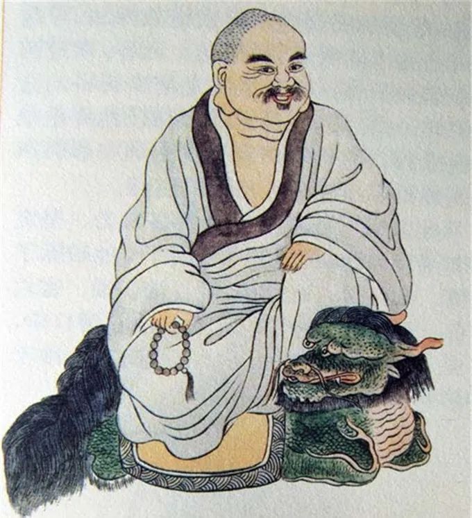 尊者法相所现为正面而坐,面露笑容,右手持念珠,身下为一灵兽。