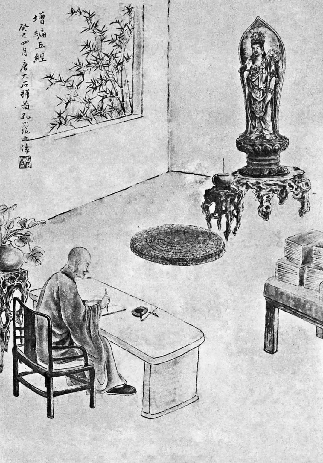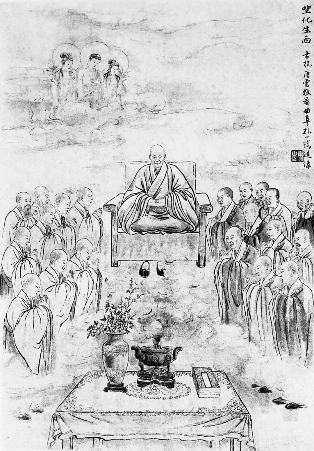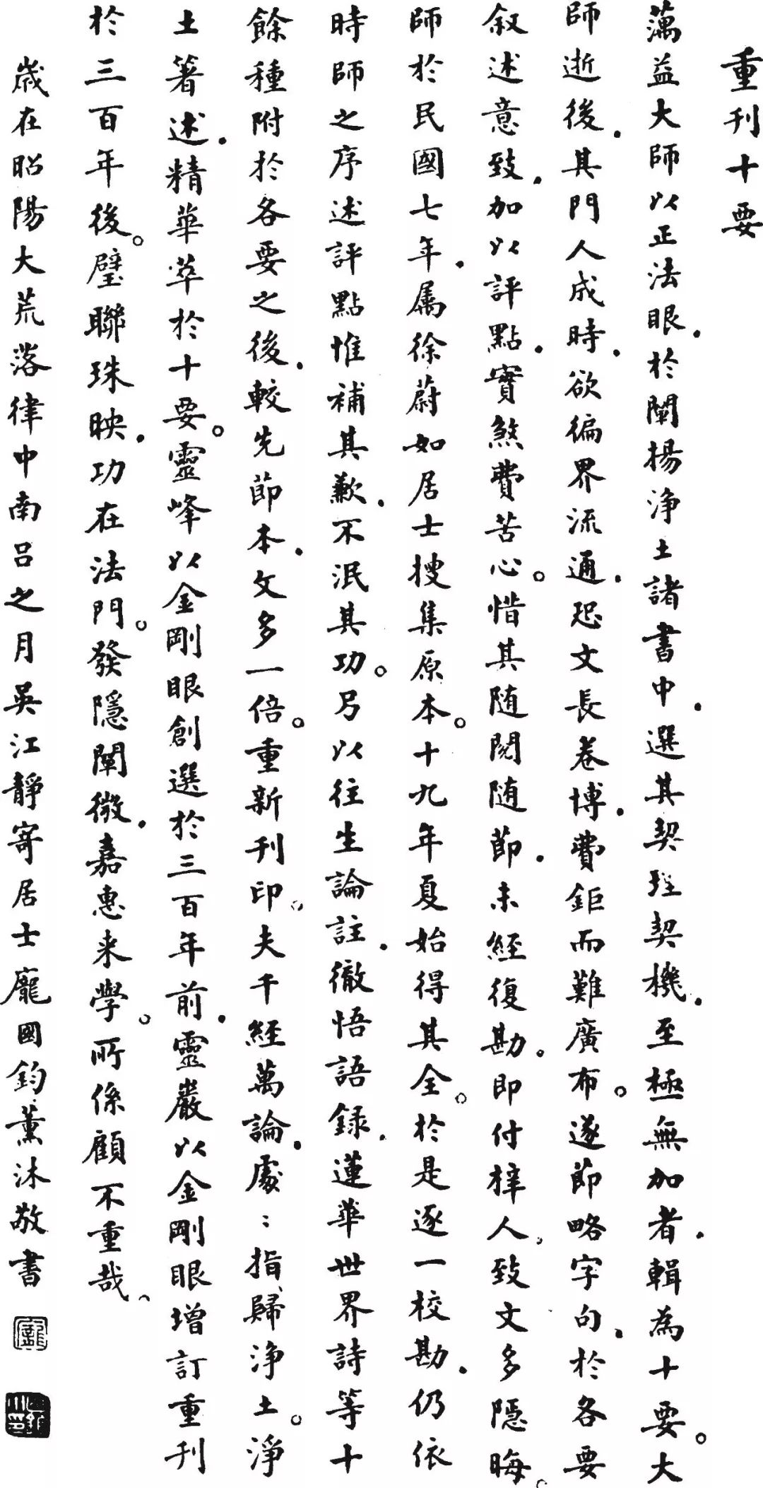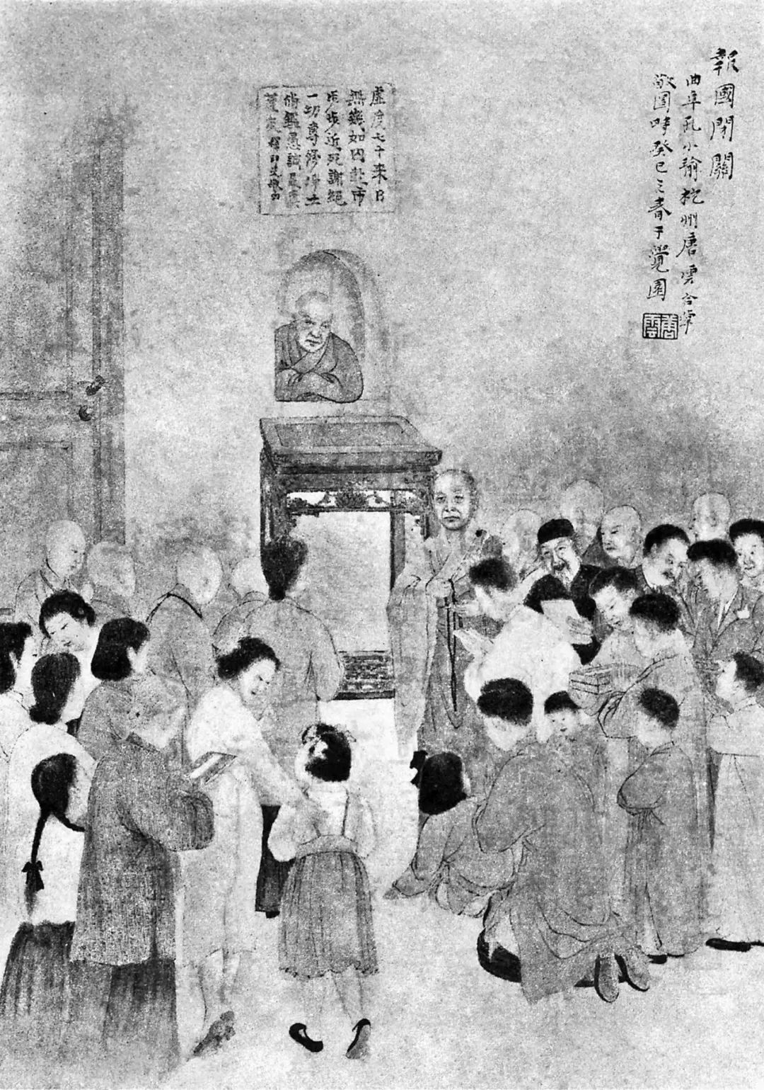 清光绪二十年,余在普陀山。法雨寺化闻和尚,敦请印光大师讲经,得与识面。讲经事竣,大师即在寺阅藏,历二十余年,日对一编,足不出户限,故诸经之奥,靡不贯通。日常行持,抱定一句南无阿弥陀佛,盖因深通教义,故益重视念佛法门。佛所说法,无一法不是疗治众生之病苦,念佛法门,名为阿伽陀药,总治一切病,但能信心坚固,愿行深切,决定得到圆满利益。如大师之真实行持,脚踏实地,禅讲兼通,而归宗于净土,昌明大法,密护诸宗,常以诸恶莫作,众善奉行,敦伦尽分,闲邪存诚,深信因果,老实念佛等语教人,不标新,不玄奇,所谓道在平常日用间,其一生之功行事迹,及本身成就,昭昭在人耳目,不待余之饶舌也。兹者,其弟子灵岩妙真和尚,及了然、德森、廉音、如岑诸法师,周孟由、吴谷宜、费范九、袁伯庸、窦存我、游有维众居士,为纪念大师,传播遗教,以宏扬净土,特聘沪上名画家唐云、孔小瑜,合作大师画传廿五幅,每幅之后,系以略传,分请名书家书写,由灵岩山寺制印成册,广为流通。窃以归依佛祖,要假型仪,即像道存,藉起信愿。盖凡心陋劣,未能触途成观,正法之时,已因见相而发心,像季之中,更须见像而造福。昔阿难白佛言:我见如来三十二相,胜妙殊绝,形体映彻,犹如琉璃,是以渴仰,从佛剃落。以此观之,阿难佛弟,尚观胜相而发心,况凡愚者乎!吾国各宗历代祖师,都有画像、或塑像流传,然未若今此画传,以生华之笔,用色彩写真,将大师一生事迹,跃然表现於纸上,是亦现代艺林之大观,而我佛门之盛事也。大师弟子遍寰宇,多服膺其教言,而未亲其道范,今有此画传流通,使天下后世,永得瞻仰,如同亲炙,则大师之遗教,亦永垂不朽矣!惟愿诸仁者,由影得心,由心得道,闻画说法,共证真常,同生净土焉。