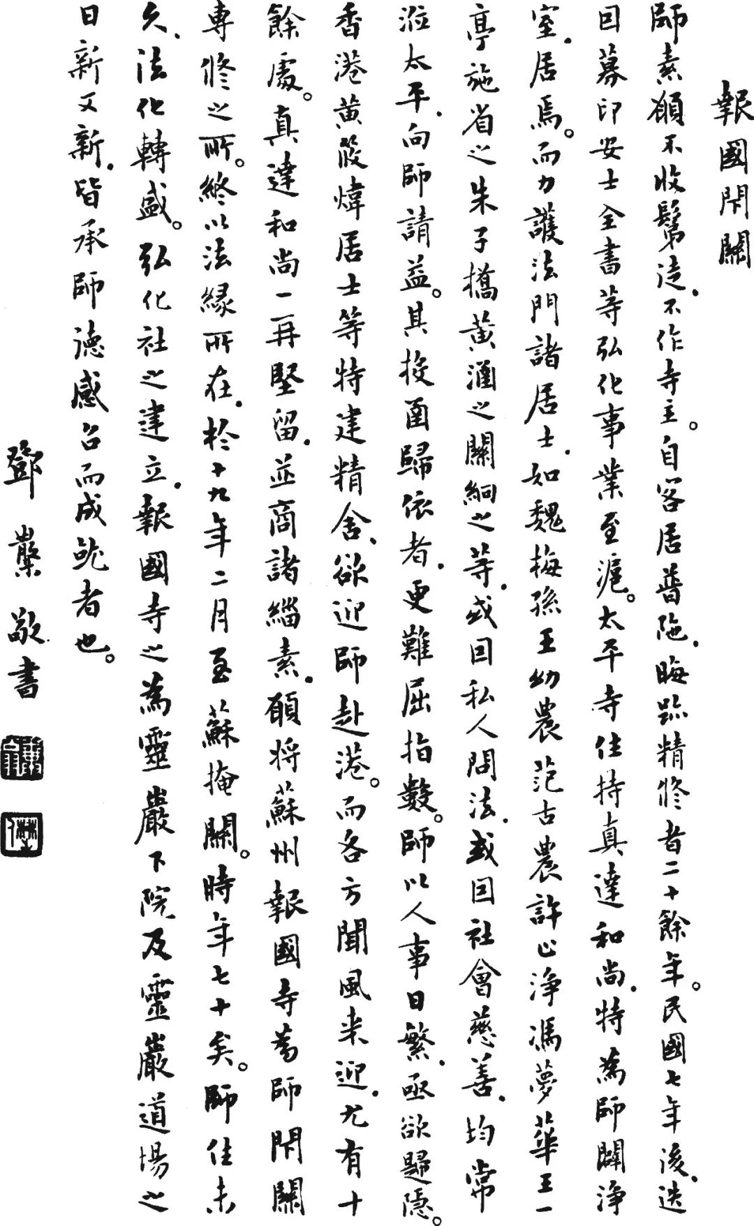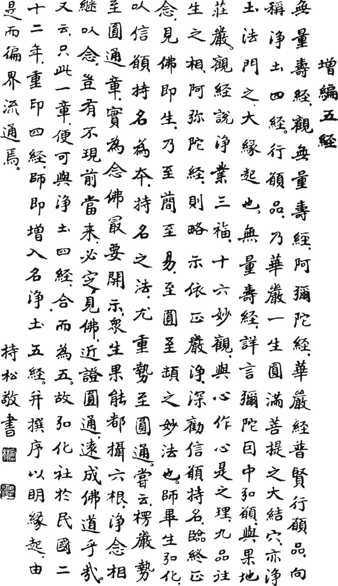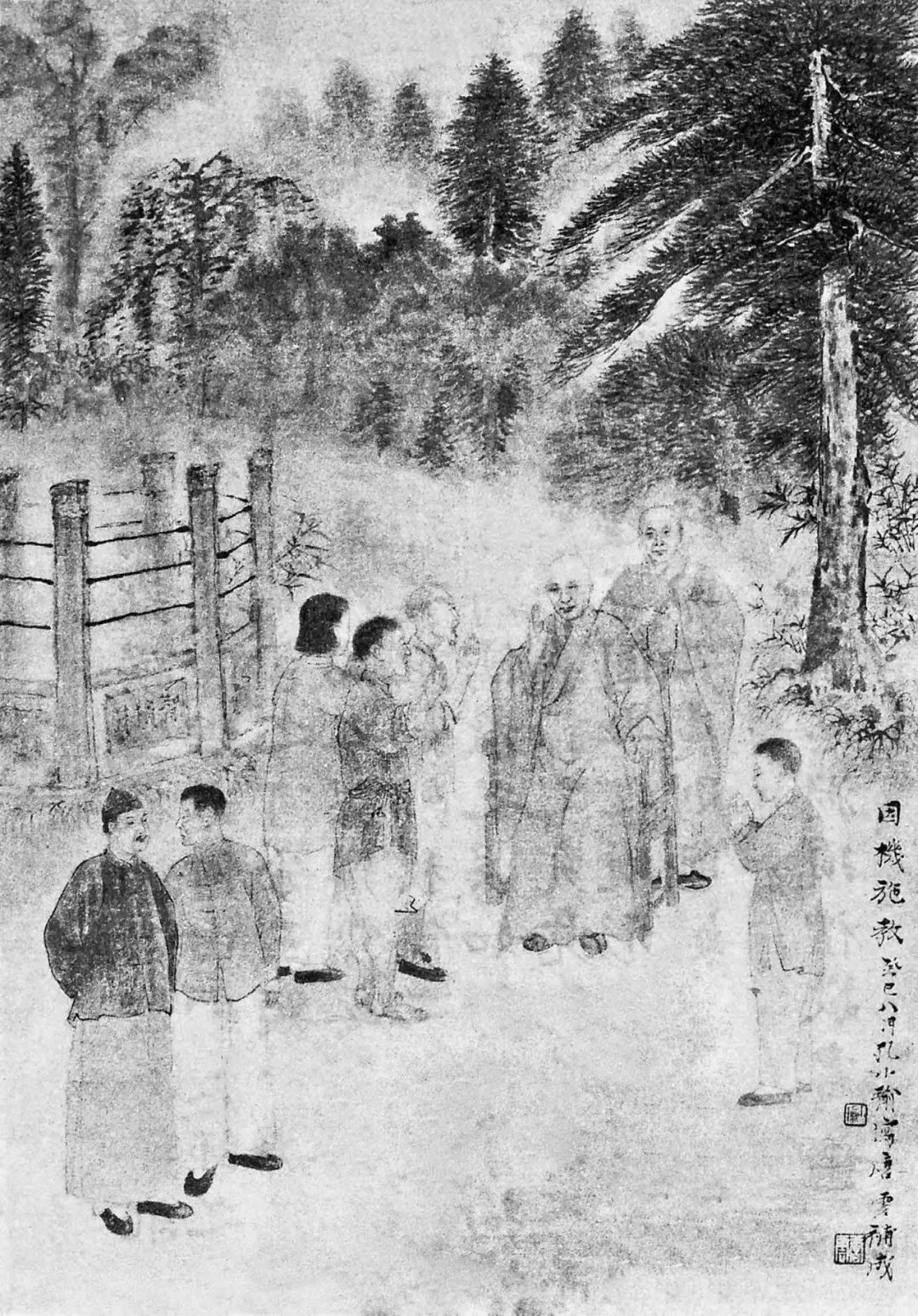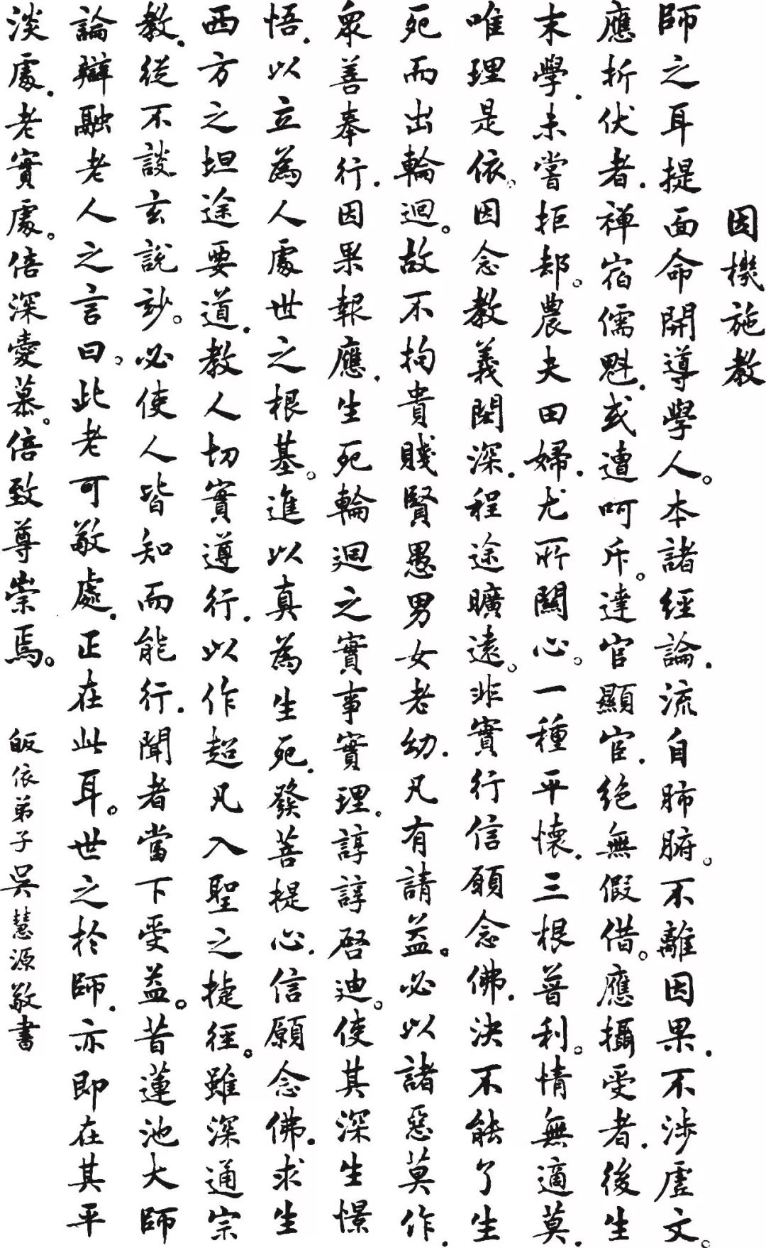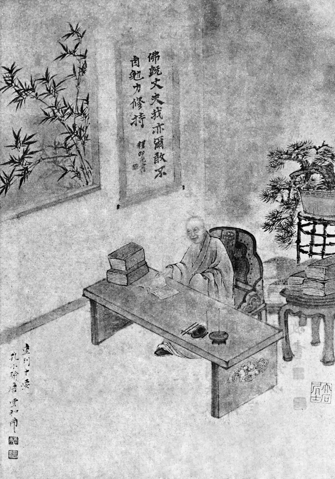 清光绪二十年,余在普陀山。法雨寺化闻和尚,敦请印光大师讲经,得与识面。讲经事竣,大师即在寺阅藏,历二十余年,日对一编,足不出户限,故诸经之奥,靡不贯通。日常行持,抱定一句南无阿弥陀佛,盖因深通教义,故益重视念佛法门。佛所说法,无一法不是疗治众生之病苦,念佛法门,名为阿伽陀药,总治一切病,但能信心坚固,愿行深切,决定得到圆满利益。如大师之真实行持,脚踏实地,禅讲兼通,而归宗于净土,昌明大法,密护诸宗,常以诸恶莫作,众善奉行,敦伦尽分,闲邪存诚,深信因果,老实念佛等语教人,不标新,不玄奇,所谓道在平常日用间,其一生之功行事迹,及本身成就,昭昭在人耳目,不待余之饶舌也。兹者,其弟子灵岩妙真和尚,及了然、德森、廉音、如岑诸法师,周孟由、吴谷宜、费范九、袁伯庸、窦存我、游有维众居士,为纪念大师,传播遗教,以宏扬净土,特聘沪上名画家唐云、孔小瑜,合作大师画传廿五幅,每幅之后,系以略传,分请名书家书写,由灵岩山寺制印成册,广为流通。窃以归依佛祖,要假型仪,即像道存,藉起信愿。盖凡心陋劣,未能触途成观,正法之时,已因见相而发心,像季之中,更须见像而造福。昔阿难白佛言:我见如来三十二相,胜妙殊绝,形体映彻,犹如琉璃,是以渴仰,从佛剃落。以此观之,阿难佛弟,尚观胜相而发心,况凡愚者乎!吾国各宗历代祖师,都有画像、或塑像流传,然未若今此画传,以生华之笔,用色彩写真,将大师一生事迹,跃然表现於纸上,是亦现代艺林之大观,而我佛门之盛事也。大师弟子遍寰宇,多服膺其教言,而未亲其道范,今有此画传流通,使天下后世,永得瞻仰,如同亲炙,则大师之遗教,亦永垂不朽矣!惟愿诸仁者,由影得心,由心得道,闻画说法,共证真常,同生净土焉。