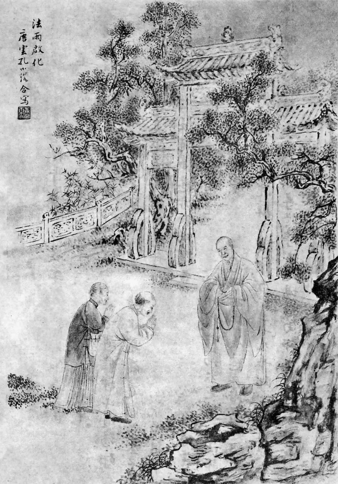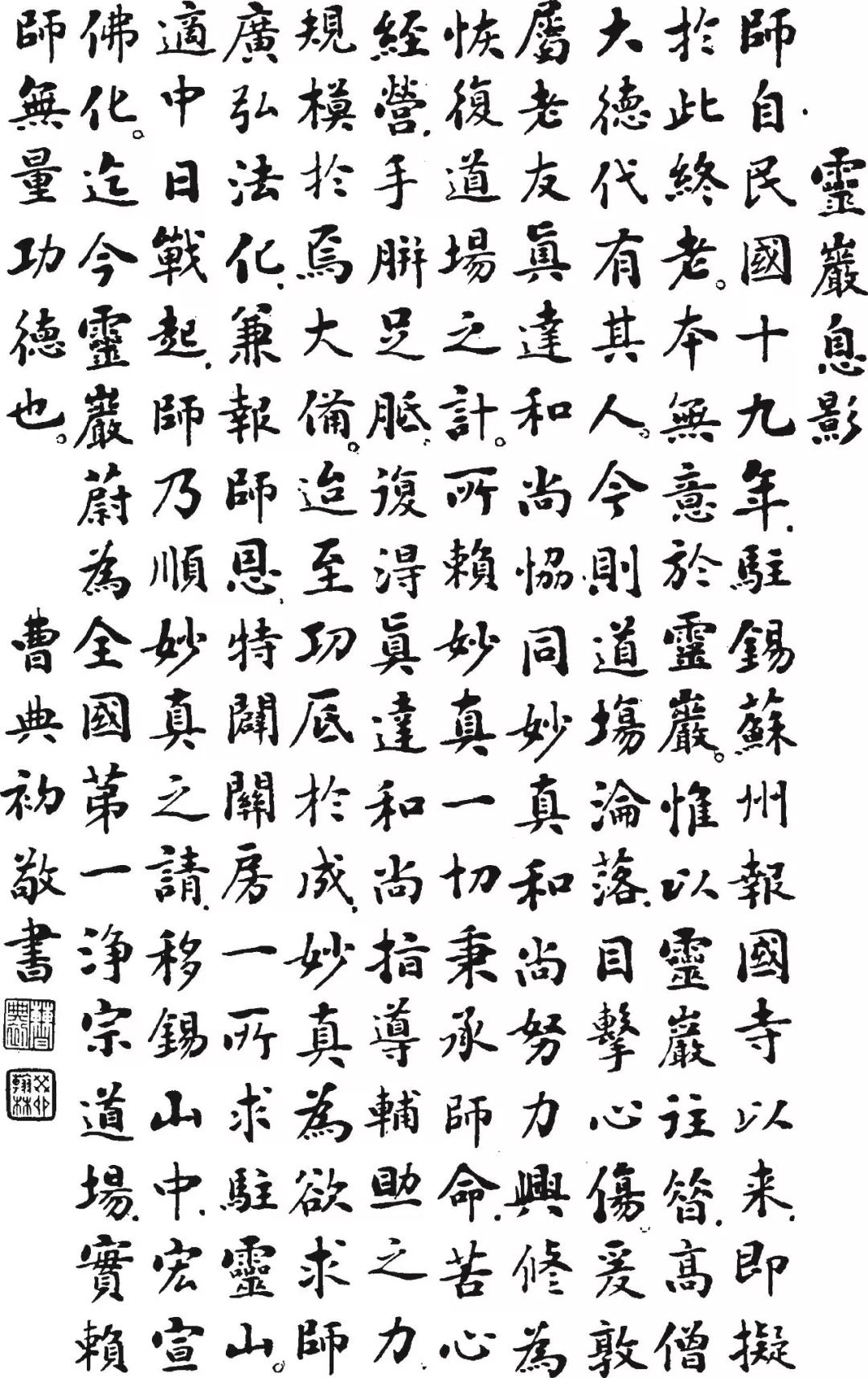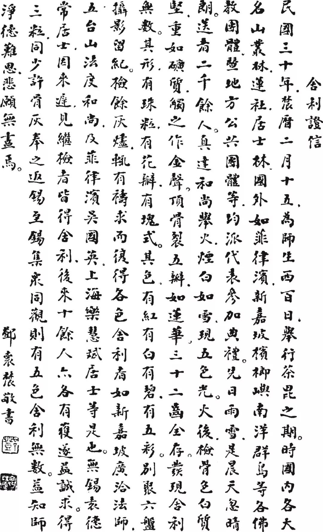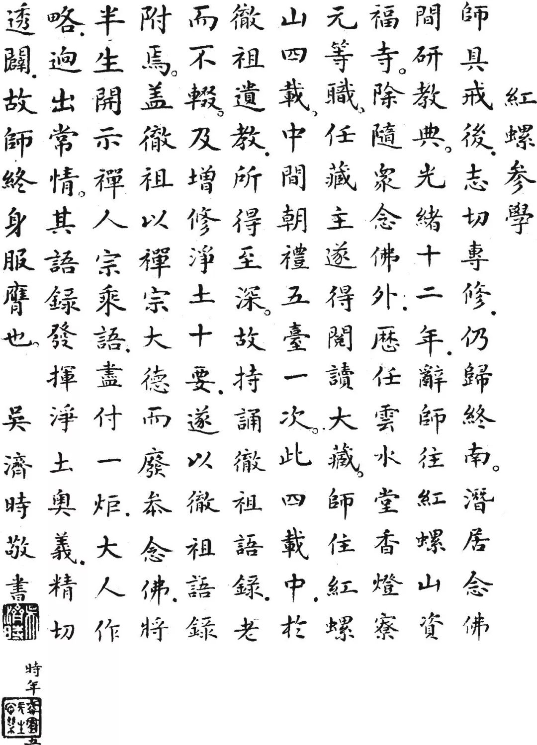 清光绪二十年,余在普陀山。法雨寺化闻和尚,敦请印光大师讲经,得与识面。讲经事竣,大师即在寺阅藏,历二十余年,日对一编,足不出户限,故诸经之奥,靡不贯通。日常行持,抱定一句南无阿弥陀佛,盖因深通教义,故益重视念佛法门。佛所说法,无一法不是疗治众生之病苦,念佛法门,名为阿伽陀药,总治一切病,但能信心坚固,愿行深切,决定得到圆满利益。如大师之真实行持,脚踏实地,禅讲兼通,而归宗于净土,昌明大法,密护诸宗,常以诸恶莫作,众善奉行,敦伦尽分,闲邪存诚,深信因果,老实念佛等语教人,不标新,不玄奇,所谓道在平常日用间,其一生之功行事迹,及本身成就,昭昭在人耳目,不待余之饶舌也。兹者,其弟子灵岩妙真和尚,及了然、德森、廉音、如岑诸法师,周孟由、吴谷宜、费范九、袁伯庸、窦存我、游有维众居士,为纪念大师,传播遗教,以宏扬净土,特聘沪上名画家唐云、孔小瑜,合作大师画传廿五幅,每幅之后,系以略传,分请名书家书写,由灵岩山寺制印成册,广为流通。窃以归依佛祖,要假型仪,即像道存,藉起信愿。盖凡心陋劣,未能触途成观,正法之时,已因见相而发心,像季之中,更须见像而造福。昔阿难白佛言:我见如来三十二相,胜妙殊绝,形体映彻,犹如琉璃,是以渴仰,从佛剃落。以此观之,阿难佛弟,尚观胜相而发心,况凡愚者乎!吾国各宗历代祖师,都有画像、或塑像流传,然未若今此画传,以生华之笔,用色彩写真,将大师一生事迹,跃然表现於纸上,是亦现代艺林之大观,而我佛门之盛事也。大师弟子遍寰宇,多服膺其教言,而未亲其道范,今有此画传流通,使天下后世,永得瞻仰,如同亲炙,则大师之遗教,亦永垂不朽矣!惟愿诸仁者,由影得心,由心得道,闻画说法,共证真常,同生净土焉。