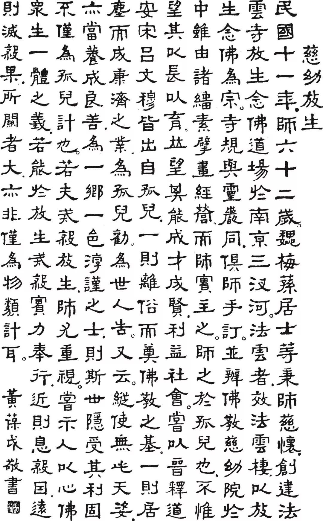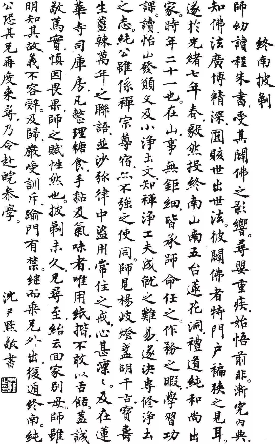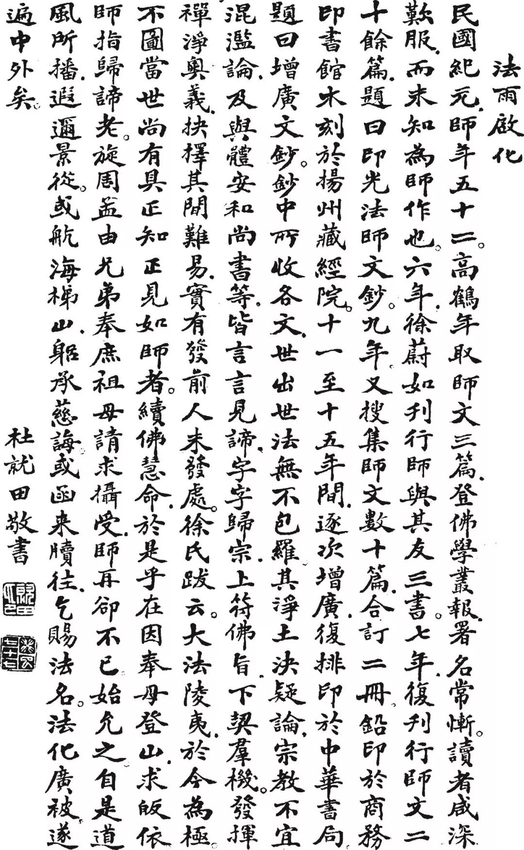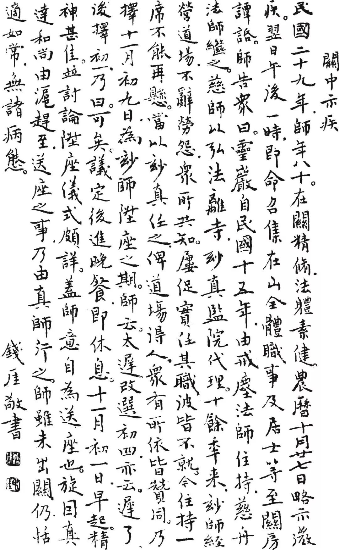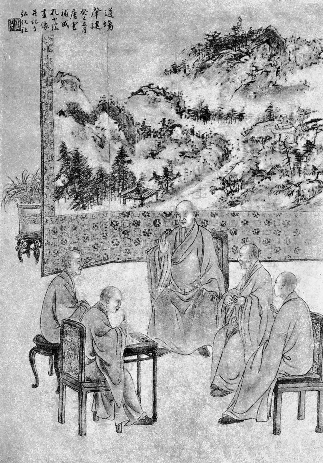 清光绪二十年,余在普陀山。法雨寺化闻和尚,敦请印光大师讲经,得与识面。讲经事竣,大师即在寺阅藏,历二十余年,日对一编,足不出户限,故诸经之奥,靡不贯通。日常行持,抱定一句南无阿弥陀佛,盖因深通教义,故益重视念佛法门。佛所说法,无一法不是疗治众生之病苦,念佛法门,名为阿伽陀药,总治一切病,但能信心坚固,愿行深切,决定得到圆满利益。如大师之真实行持,脚踏实地,禅讲兼通,而归宗于净土,昌明大法,密护诸宗,常以诸恶莫作,众善奉行,敦伦尽分,闲邪存诚,深信因果,老实念佛等语教人,不标新,不玄奇,所谓道在平常日用间,其一生之功行事迹,及本身成就,昭昭在人耳目,不待余之饶舌也。兹者,其弟子灵岩妙真和尚,及了然、德森、廉音、如岑诸法师,周孟由、吴谷宜、费范九、袁伯庸、窦存我、游有维众居士,为纪念大师,传播遗教,以宏扬净土,特聘沪上名画家唐云、孔小瑜,合作大师画传廿五幅,每幅之后,系以略传,分请名书家书写,由灵岩山寺制印成册,广为流通。窃以归依佛祖,要假型仪,即像道存,藉起信愿。盖凡心陋劣,未能触途成观,正法之时,已因见相而发心,像季之中,更须见像而造福。昔阿难白佛言:我见如来三十二相,胜妙殊绝,形体映彻,犹如琉璃,是以渴仰,从佛剃落。以此观之,阿难佛弟,尚观胜相而发心,况凡愚者乎!吾国各宗历代祖师,都有画像、或塑像流传,然未若今此画传,以生华之笔,用色彩写真,将大师一生事迹,跃然表现於纸上,是亦现代艺林之大观,而我佛门之盛事也。大师弟子遍寰宇,多服膺其教言,而未亲其道范,今有此画传流通,使天下后世,永得瞻仰,如同亲炙,则大师之遗教,亦永垂不朽矣!惟愿诸仁者,由影得心,由心得道,闻画说法,共证真常,同生净土焉。