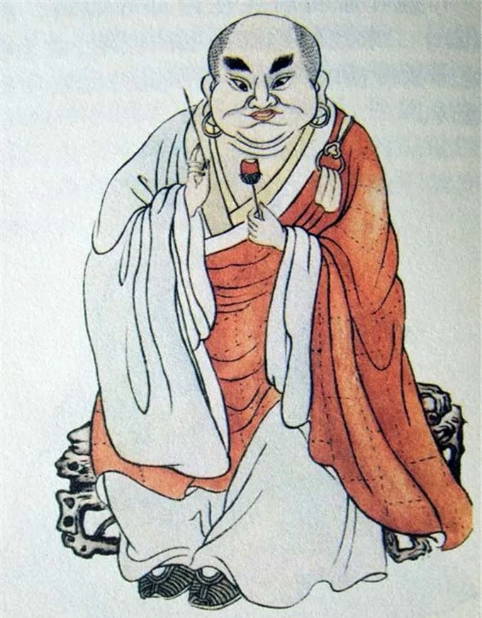 尊者法相所现为身披袈裟,正面而坐,圆面大耳,双手持法器。