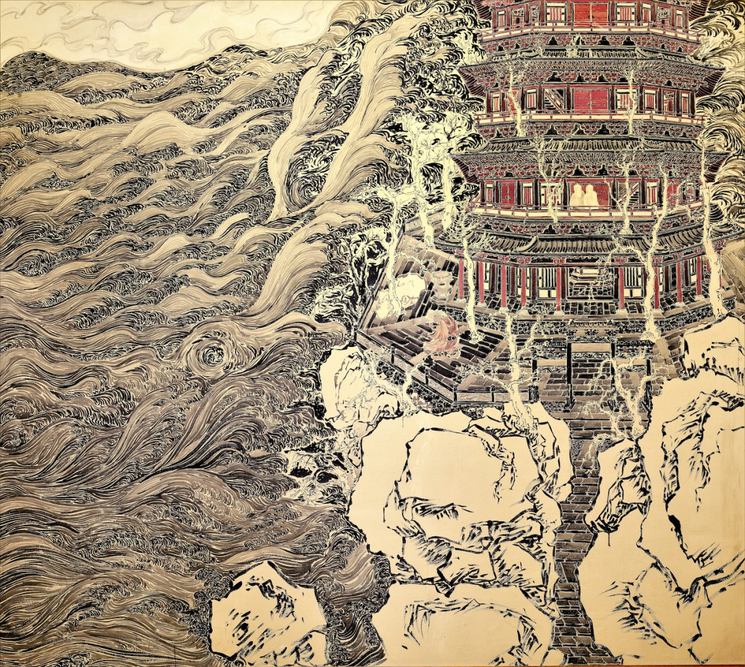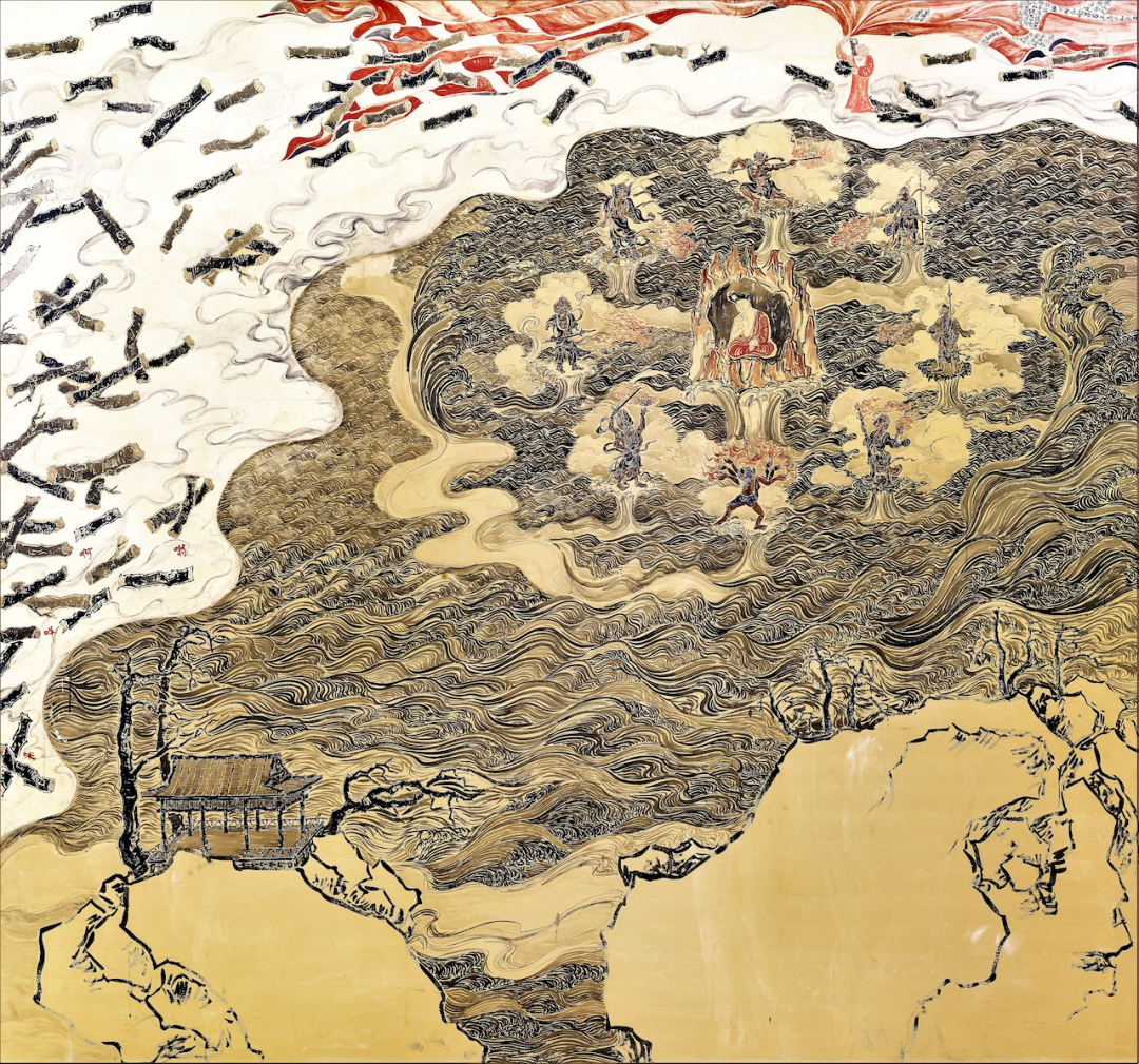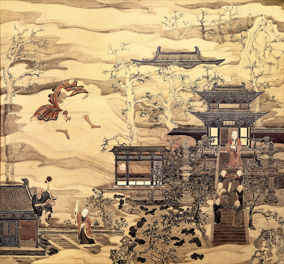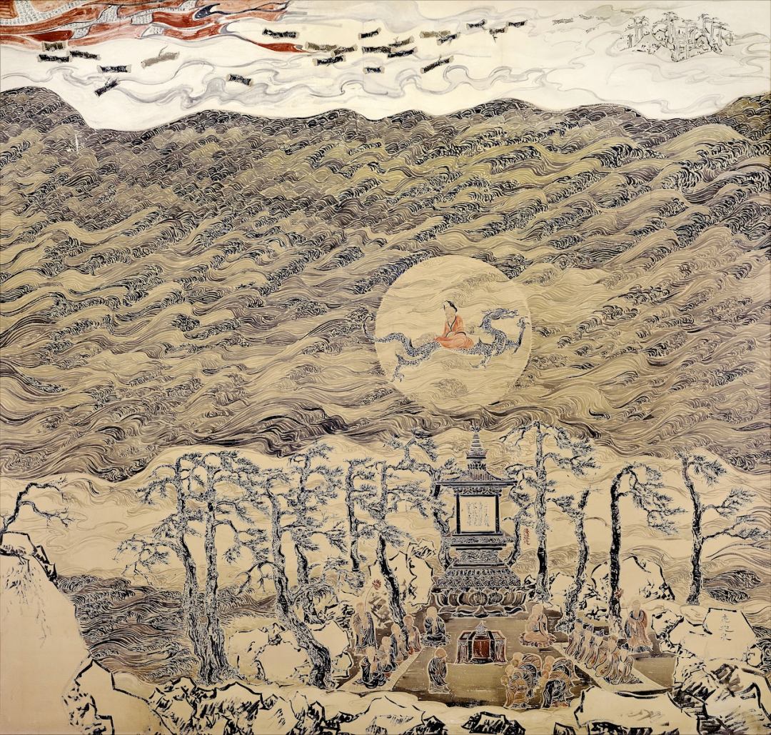 降龙罗汉显圣人间,普度众生,功德圆满,回归天台石梁五百罗汉道场。但见天台山寺院殿宇宏伟,宝塔瑰奇,香霭飘逸,法音清丽,石梁横亘云天,下临万丈深渊。五百位梵僧,或坐或卧、或住或行,游戏习定,瞬息万变。降龙罗汉自莲中化现,与众罗汉留连于八峰双涧之间。