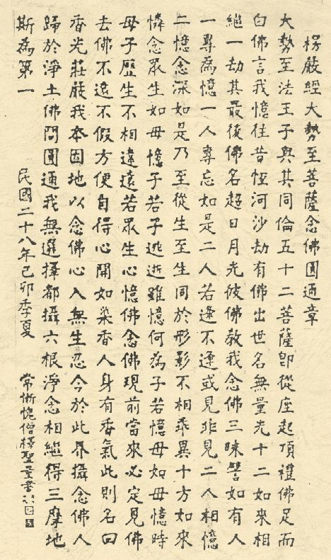 《大势至菩萨念佛圆通章》是《楞严经》二十五圆通章之一,乃大势至菩萨亲口宣说。在《大势至菩萨念佛圆通章》中,大势至菩萨云:“都摄六根,净念相继,得三摩地,斯为第一。”六根即眼、耳、鼻、舌、身、意。心即意根,口即舌根,听即耳根。心念、口念、耳听,此三根一摄,眼也不会东张西望,鼻也不会闻别的气味,身也不敢放逸懈怠,故名都摄六根。都摄六根而念,自无污杂妄念,故名净念。净念必须要常常相继不断,故名净念相继。能净念相继,久而久之,则得念佛三昧。此都摄六根,净念相继,为得三昧之第一妙法,故云:得三摩地,斯为第一。