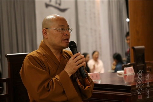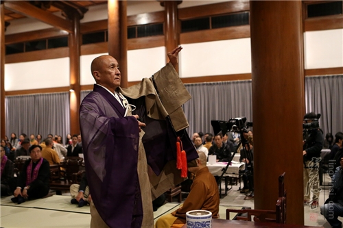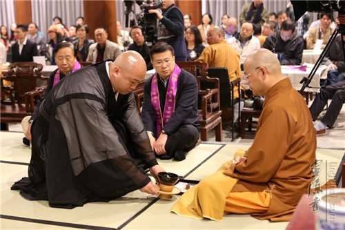光泉大和尚介绍了径山茶礼回归的故事,那是在多年前一次参访日本时,因偶然的机缘发现了东福寺的四头茶礼就传自古径山禅茶,欣喜之余便邀请东福寺法师到杭州灵隐寺进行演示。随后,径山寺戒兴方丈亲自前往日本东福寺考察径山茶礼,才使得这传承千年的茶礼又重现径山,丰富了径山禅茶文化内涵。