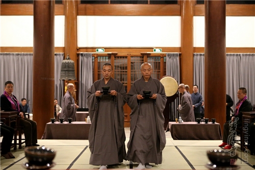 在当晚的茶会上,径山寺法师表演了径山茶礼,日本东福寺的法师则表演了四头茶礼,进行禅茶的无声交流,让现场大众领略和感受了径山禅茶的古风。
