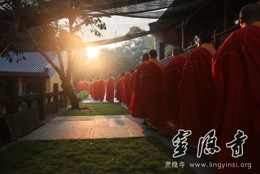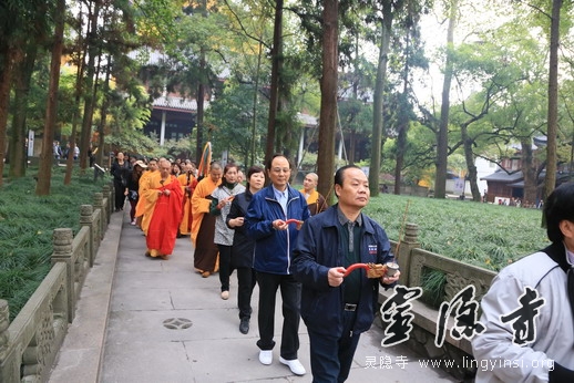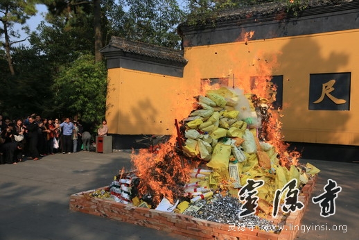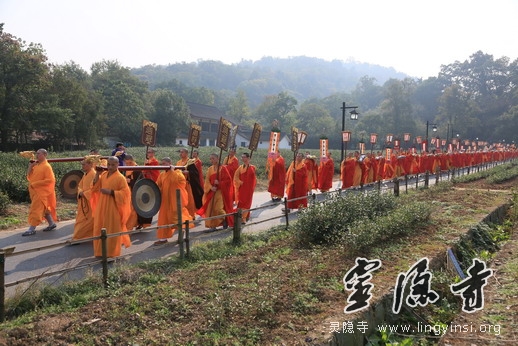 11月2日下午,举行了盛大庄严的水陆法会圆满送圣仪式。灵隐寺内钟鼓齐鸣,锣鼓喧天,慈悲圣号,梵音清扬,二序仪仗,庄严肃穆。在虔诚的念佛引导声中,继云法师、松瑞法师和常法法师三位主法师父率全体法师及诸善信人等奉请圣驾,念佛引导,齐心恭送十方法界诸佛菩萨圣众往登云路,六道四生之凡众并诸眷属往生净土。仪仗队伍中有手持提炉、灯笼、水陆灯、宝盖、开道锣、开道旗的僧众,也有持幡、灯、香、果、花的斋主、功德主和信众,在齐唱"南无阿弥陀佛"的佛号声中次第前行,引来了众多游客信众的瞩目赞叹。载着僧俗大众报恩超荐、利生成佛之宏誓大愿的极乐西方船,在灵隐寺外的"咫尺西天"举火焚化。在主法诸师的带领下,大众法师及护法居士齐声诵念回向,祈愿西方船上的所有亡灵顺利生往西方极乐净土。