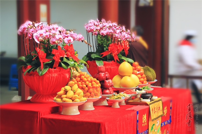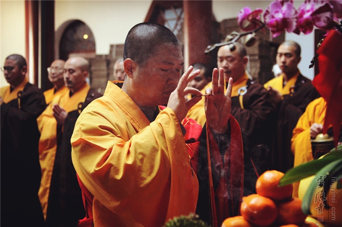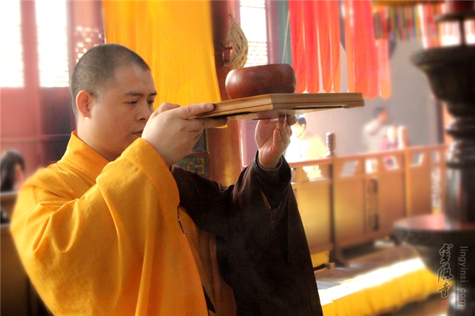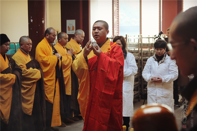 2016年12月29日,灵隐寺斋堂梵呗悠扬,灵隐寺监院廓忍法师拈香主法为即将开始的腊八粥煮制环节举行洒净仪式,以此清净道场,和合众缘。灵隐寺两序大众以及参加腊八粥食材准备的居士和义工,共同参加了本次法会。当日,斋堂煮制的第一碗腊八粥,由法师供奉在灵隐寺大雄宝殿本师释迦牟尼佛前,大众合十祈请诸佛菩萨加被,祈愿以此功德利乐有情,广结善缘。