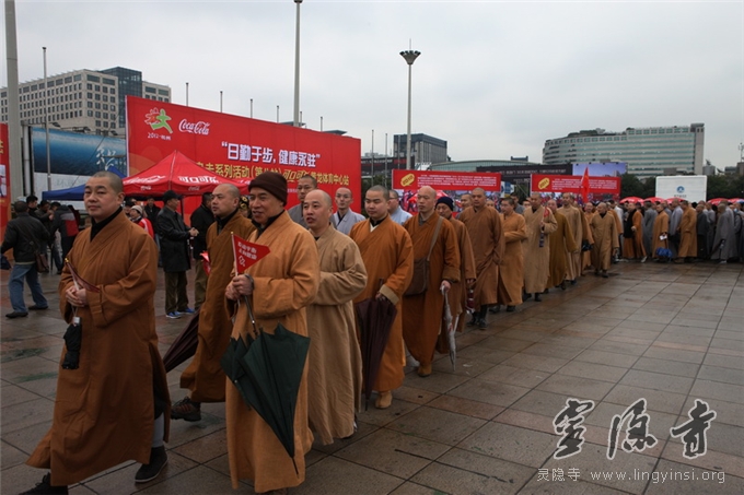 2012年12月15日,我寺30多位法师在知客心如法师的带领下,参加了在黄龙体育中心举行的"2012年杭州市‘日勤于步,健康永驻’全民健身走系列活动"最后一站活动,在点点细雨中,绕着黄龙体育中心的外场、玉古路和求是路行走一圈,带着出家人的智慧和禅意,向人们宣传以低碳的方式走出环保和谐的杭州新发展之路。