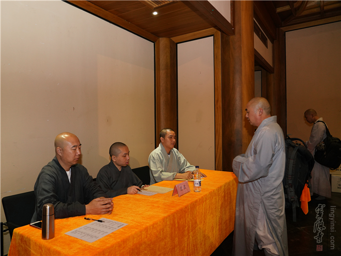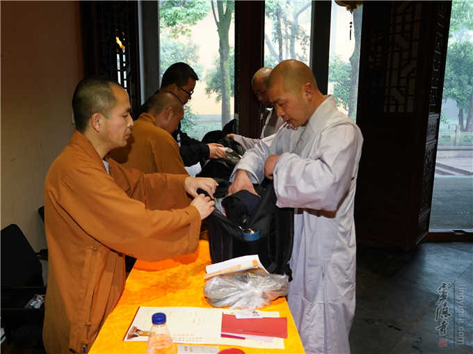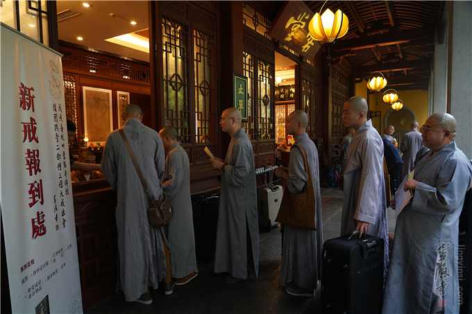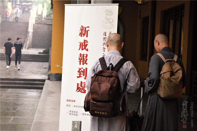 4月23日,灵隐寺"戊戌年三坛大戒传戒法会"开堂进单(报到登记)的第一天,前来灵隐寺求戒的戒子们,在引礼师的带领下,排着整齐的队伍,依次登记个人信息,接受行李检查和五堂功课的考核,领新戒证,将通讯工具及个人贵重物品寄存到常住,领取戒期所需的衣、钵、具等物品。灵隐寺传戒法会的报到登记,严格按照戒子审核要求执行不合格者,不予登记入单。这些流程中,尤其以五堂功课的考核最为关键,现场就会"面试"戒子们对五堂功课内容的背诵唱念。新戒在通过考核后领新戒证,正式成为具有入单受戒法会资格的预备僧人。