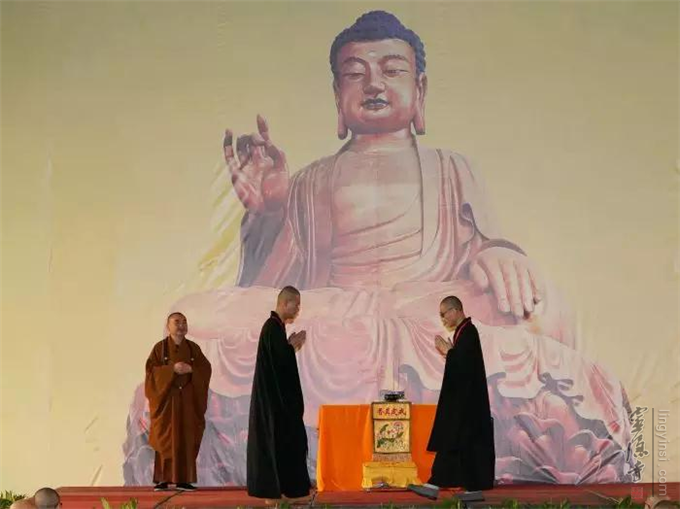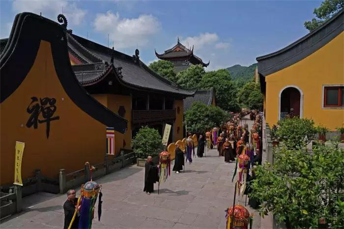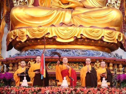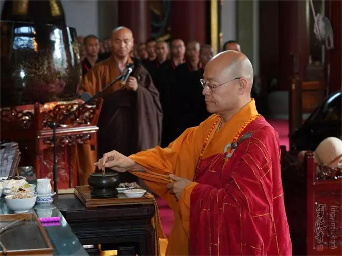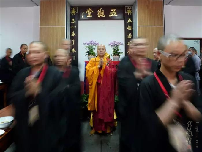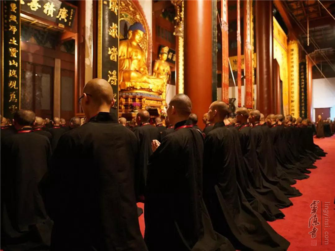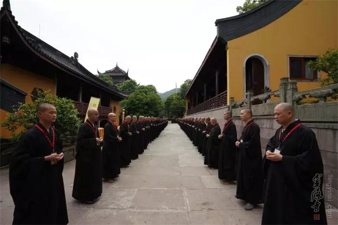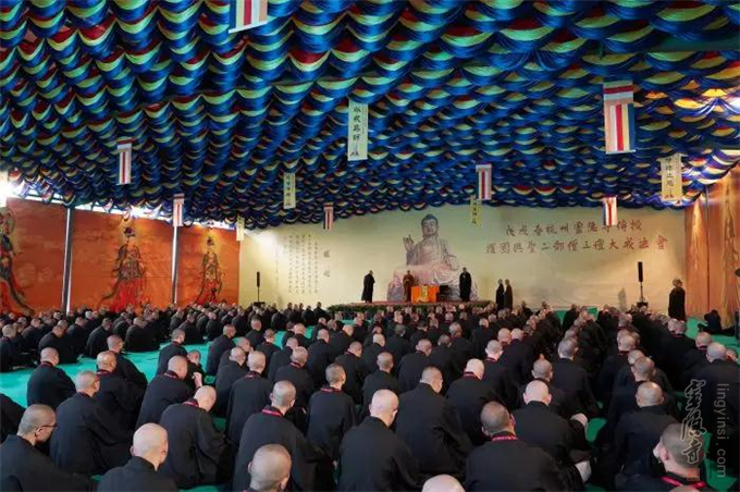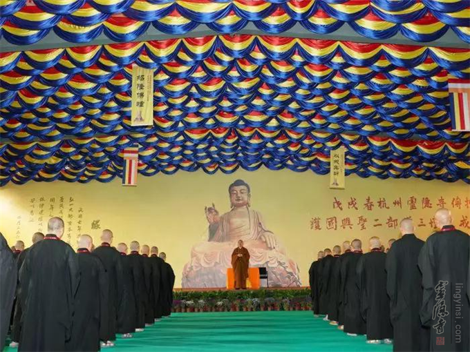 光泉大和尚秉拂说法:"灵隐梵音起悠扬,八方释子赴戒场。百年弹指如昨夜,娑椤花开满院香。即今上堂説法一句作何赞扬?花落花开、继往开来,果熟果香、是选佛场。"