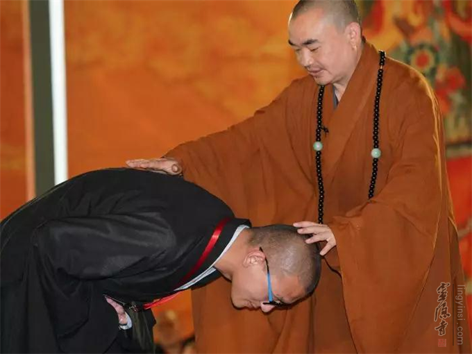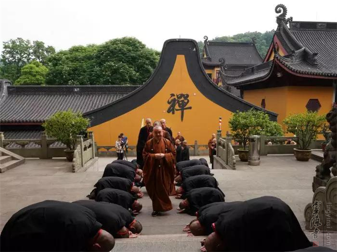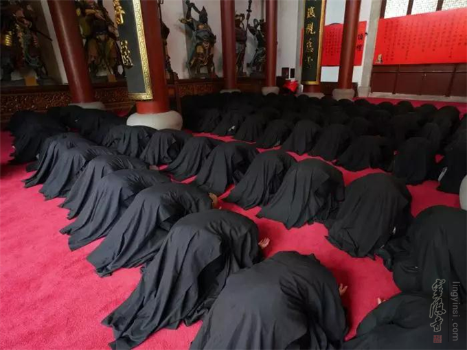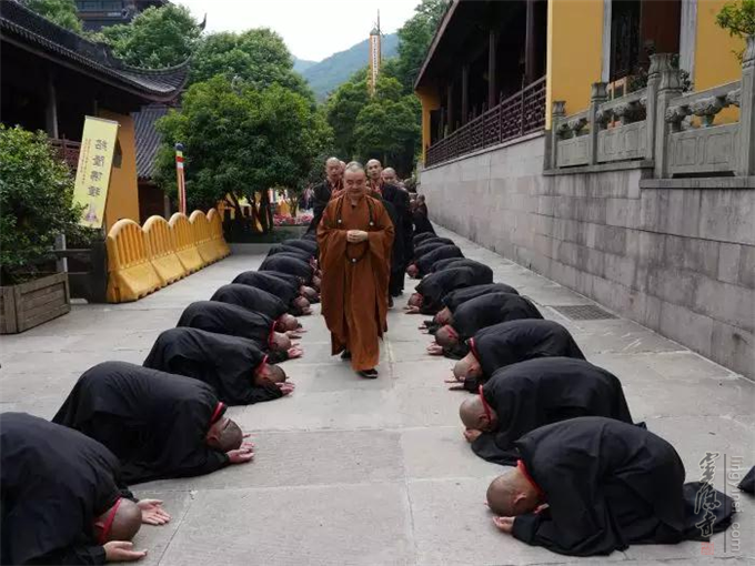 午后,在芳振律师为众新戒教授受沙弥戒后礼送戒和尚、二位阿阇黎及大众诸师下座的仪式。从药师殿到方丈室,戒子们分组排班,匍伏致礼。