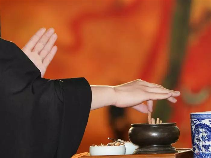 插香时,上香者的双手都是有表法的内涵:捏起的拇指和食指表示四摄,竖起的六指表六度,十个指头表示对佛陀的香、花、灯、涂、果、茶、食、宝、珠、衣十物供养。
