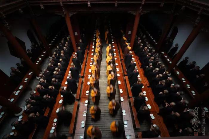 ▲光泉大和尚与戒子们在五观堂共用斋饭