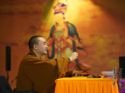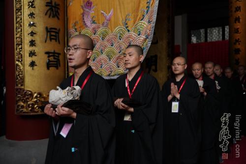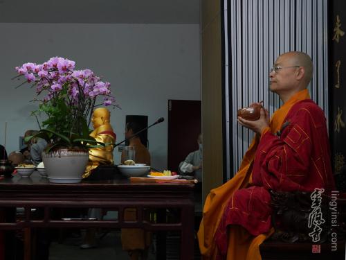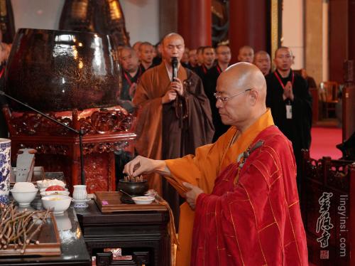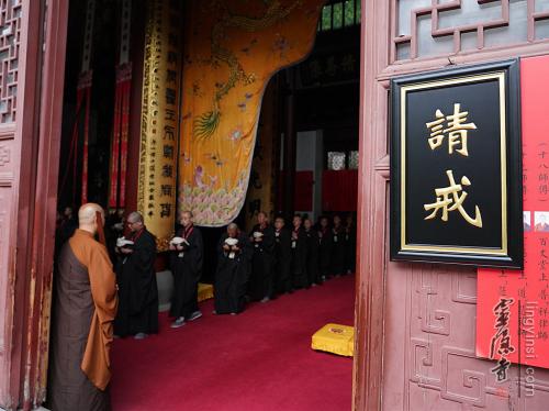 上午10时许,东阳天宝寺、杭州栖云寺、江阴神华寺、武义延福寺、南通南山寺、安吉灵峰寺等寺院两序大众率众姓护法居士发心,设上堂斋供养三宝,并迎请得戒大和尚灵隐寺方丈光泉大和尚主法。