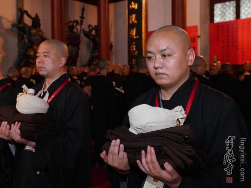 5月7日一早,灵隐寺药师殿前悬挂"通启二师"、"请戒开导"、"查验衣钵"、"剃头沐浴"、"审罪忏悔"、"呈罪称量"、"礼佛通宵"等七块佛事牌。戒子们于戒场整齐排班。诸引礼师率沙弥头、沙弥尾等,执持幡、香炉、灯、伞盖等庄严仪仗,恭迎得戒大和尚灵隐寺方丈光泉大和尚和羯磨阿阇黎、教授阿阇黎至药师殿。