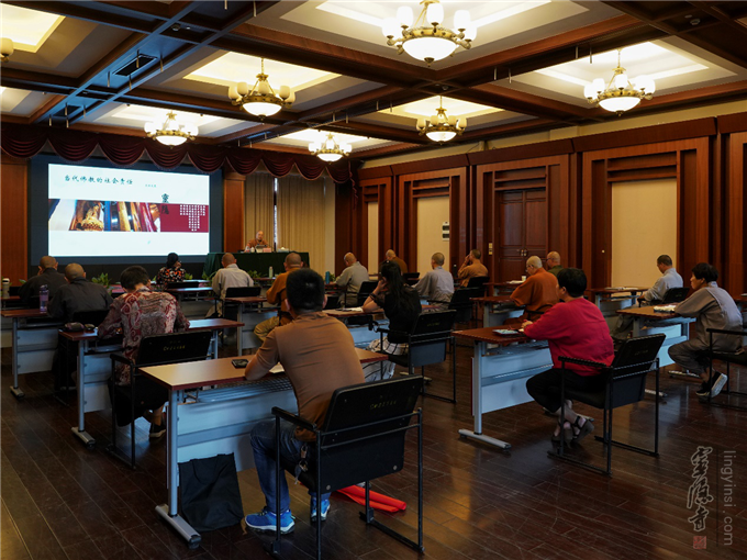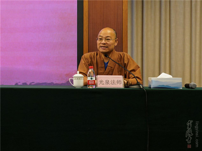 光泉法师从佛教缘起、佛教传入中国的过程、中国社会转型期现状、灵隐寺的发展历史、佛教如何承担社会责任等方面,依次深入,就佛教中国化、寺院的社会责任等内容进行了分享。