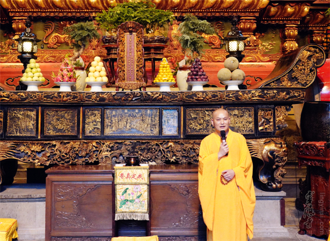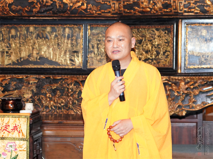 在忏摩共修开始之前,灵隐寺监院觉恒法师对志工们进行开示。他从一个"感恩三昧"的故事开始,谆谆教诲志工们要常怀感恩之心。
