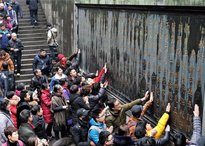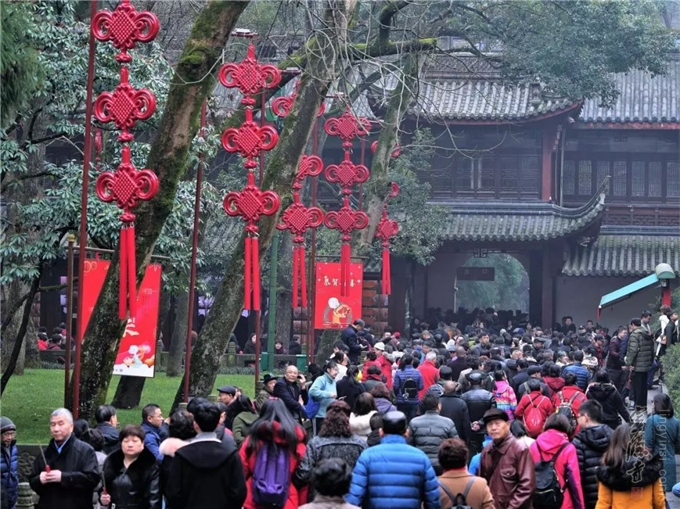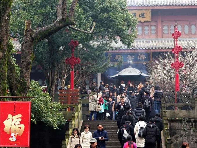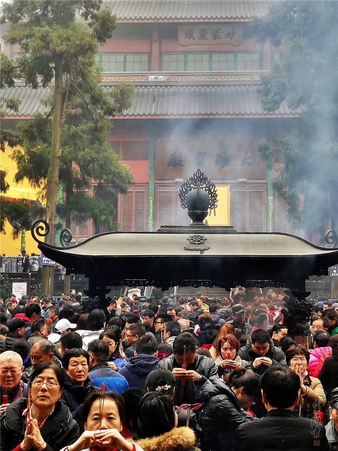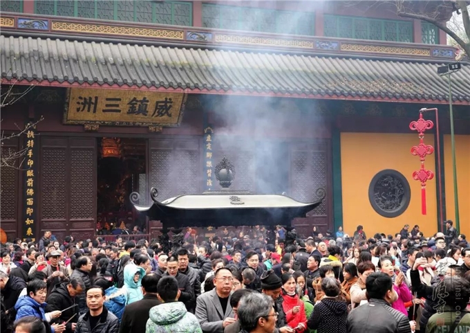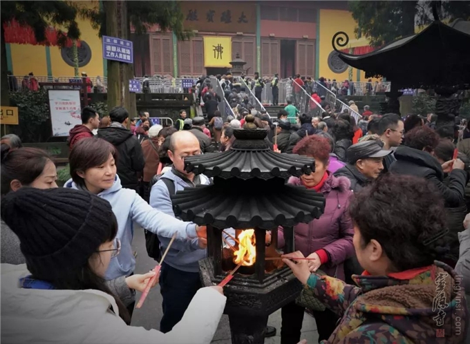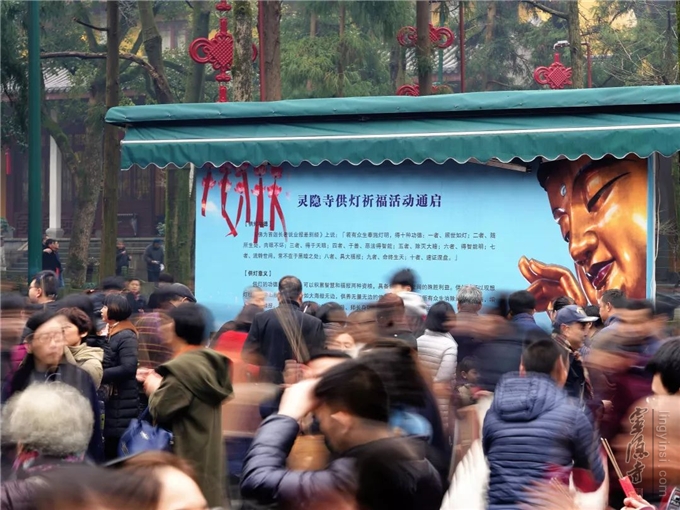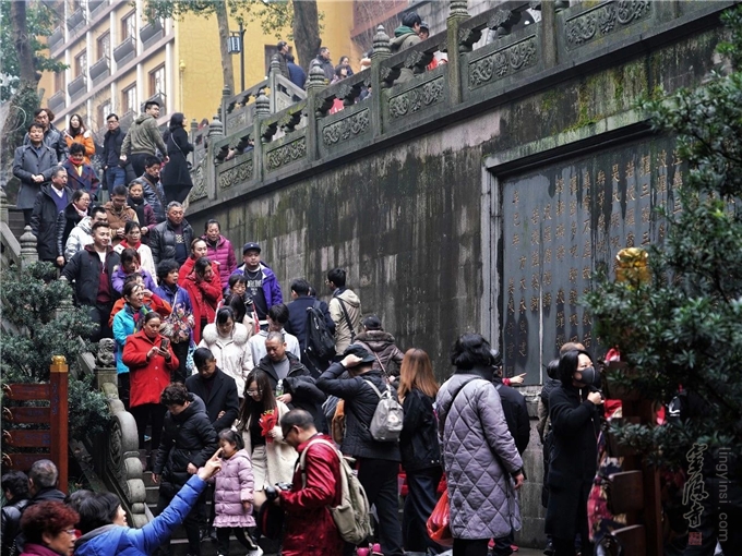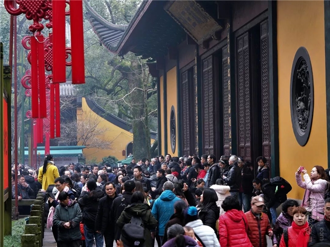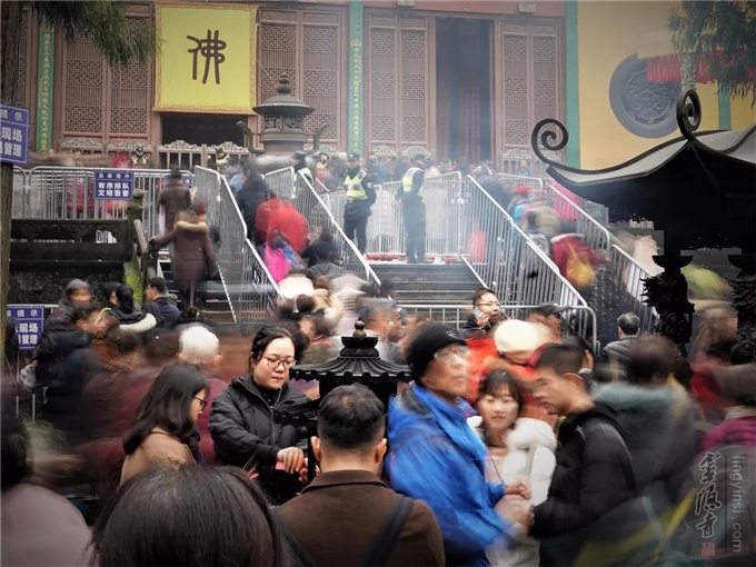 大年初一,杭州灵隐寺早上五点钟开门,比往常提前一小时。傍晚六点半清场,比往常推迟一小时。人流如潮,场面壮观。