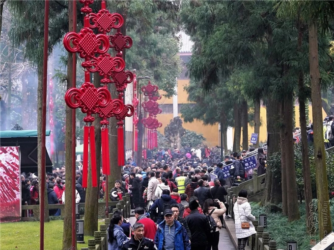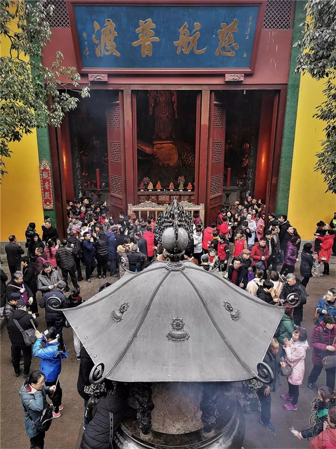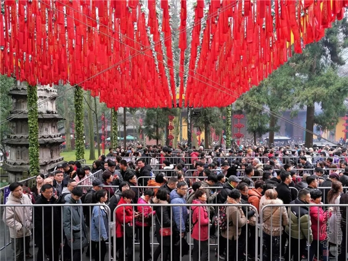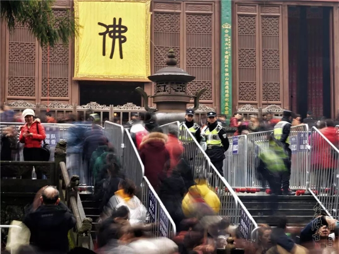 为了保障大众有序祈福,寺院增设回形护栏,引导人流排队进殿礼佛。