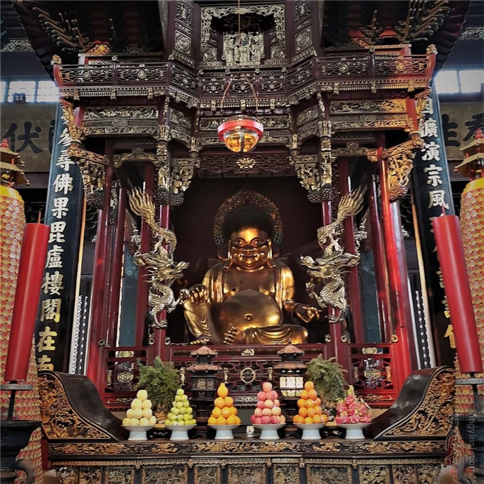 灵隐寺天王殿正中面朝山门的佛龛供奉弥勒菩萨圣像,袒胸露腹,趺坐蒲团,笑容可掬。