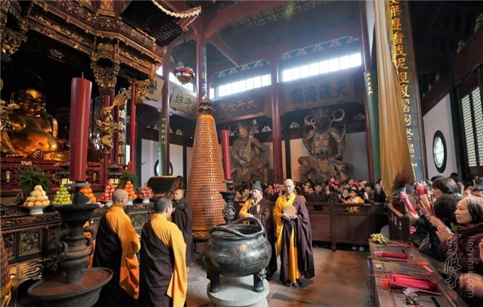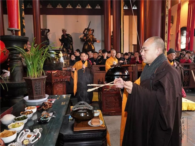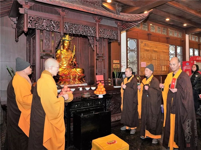 大年初一,是弥勒菩萨圣诞日。佛经中说:弥勒菩萨正于兜率天内院为诸天演说佛法。未来世弥勒菩萨将由兜率天内院下生南瞻部洲,继绍释迦,于龙华树下成等正觉,以三会之说法广度有缘。所以,这位菩萨被称为当来下生弥勒尊佛。灵隐寺常住法师从头天开始就准备弥勒圣诞日的祝圣上供仪式。