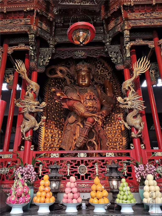 天王殿背对山门的佛龛供奉的是佛教护法神韦驮雕像,像高二米半,头戴金盔,身裹甲胄,神采奕奕。这尊雕像以香樟木雕造,是南宋留存至今的珍贵遗物,已有700多年历史。