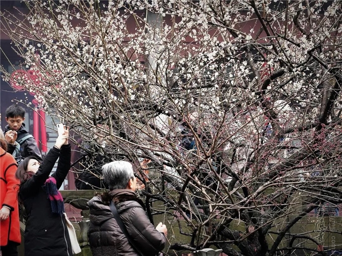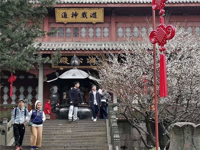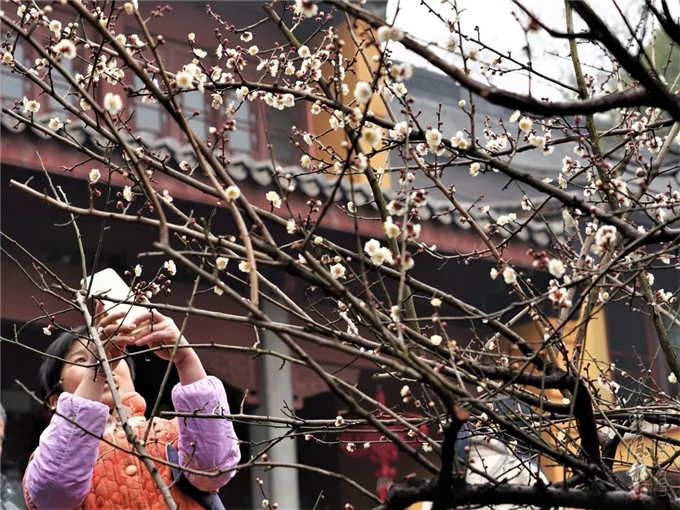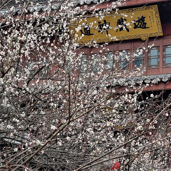 济公殿前的一株梅花,眼前开得最盛。也许是得到了神僧济公赋予的勃勃生机,这株梅花开得最早,花期最长。