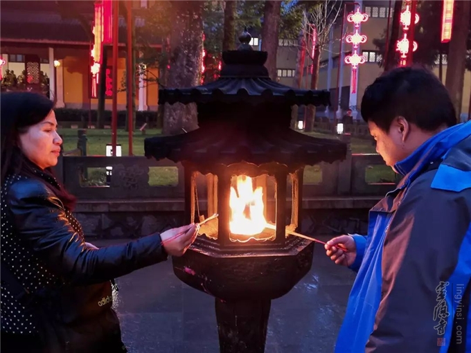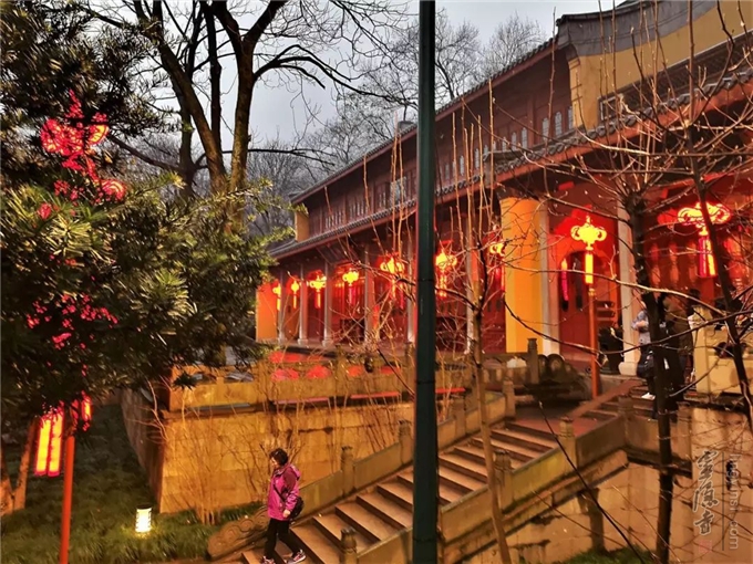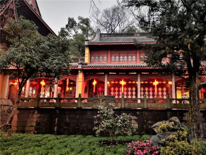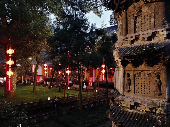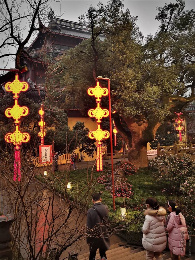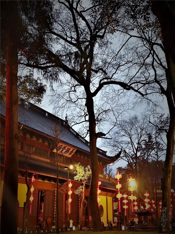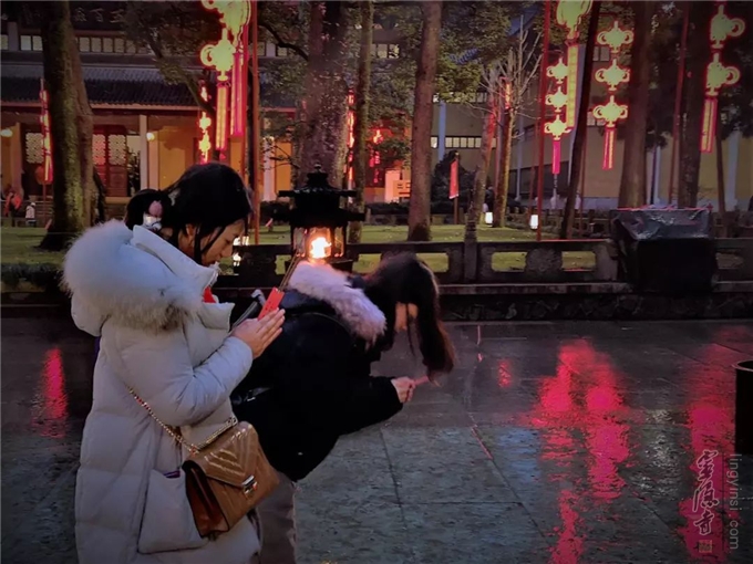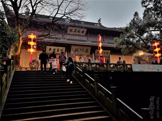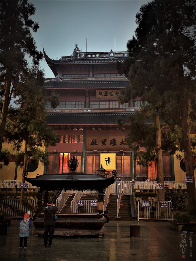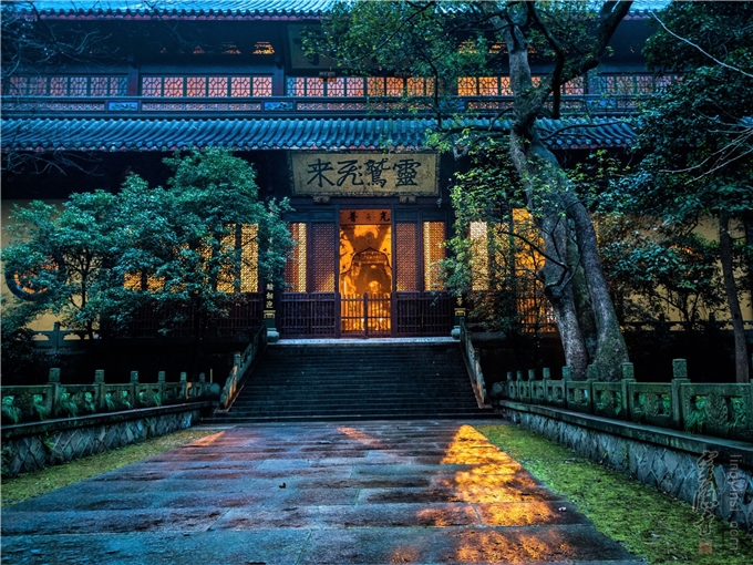 这两位游客是早上坐飞机从大连赶过来的。她们说:飞机中途经停天津,到杭州机场已经是下午三点多,在机场打的直奔灵隐,进寺院时天已渐暗。在灵隐寺院内,光与影相伴相随,真不虚此行。