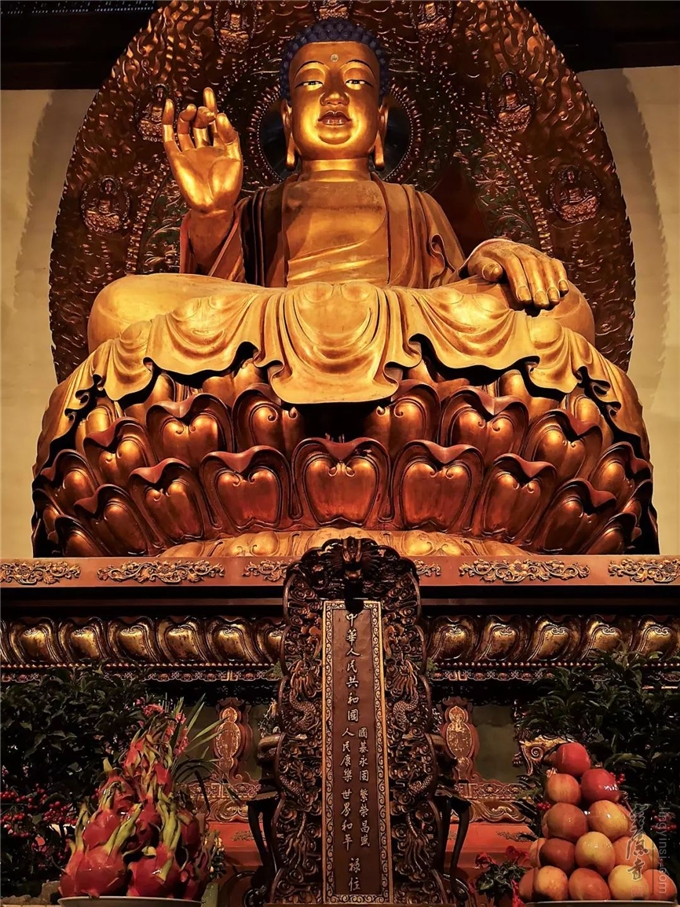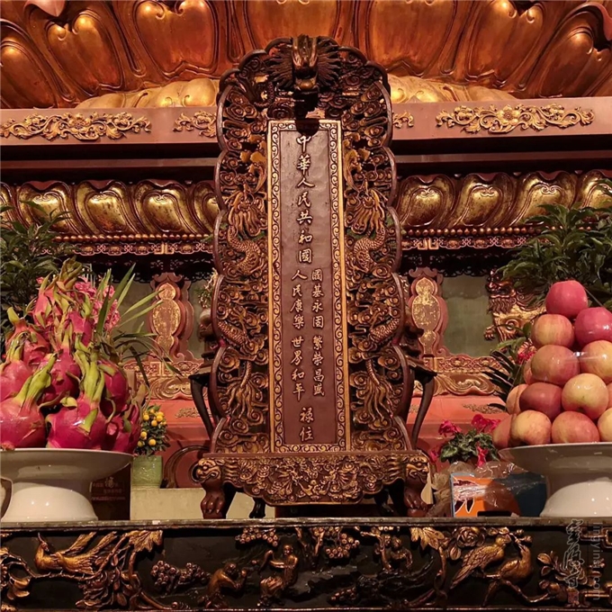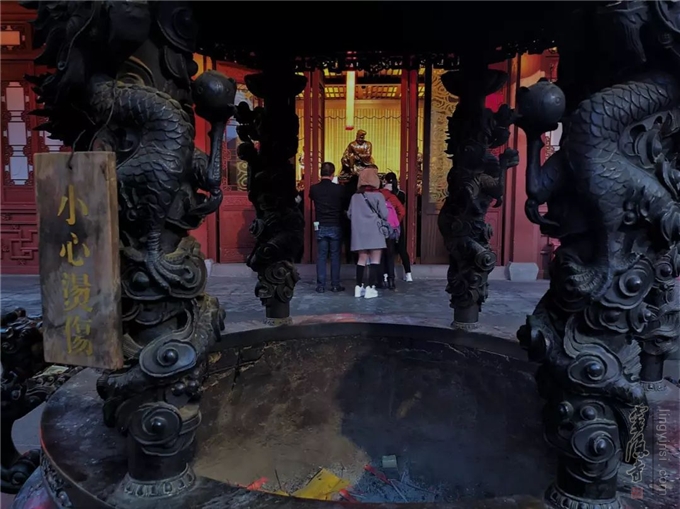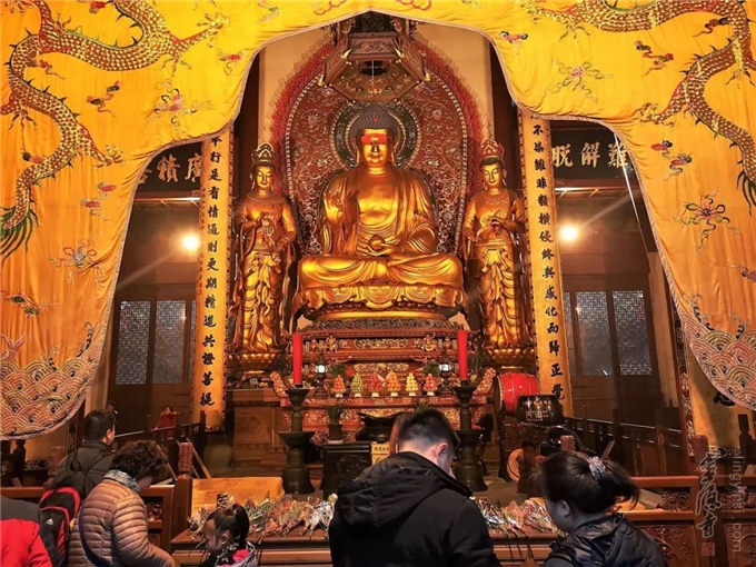 大雄宝殿,不少游客在礼佛。释迦牟尼佛圣像前供台正中,供奉的国基永固禄位牌,特别醒目。