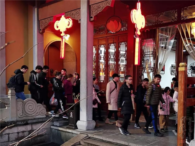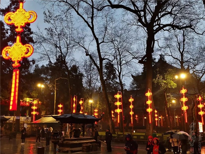 傍晚,细雨霏霏,华灯初上,浮亦朝光,许多游客流连忘返。