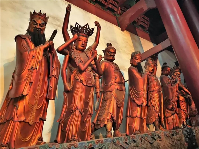 杭州灵隐寺大雄宝殿正中供奉释迦牟尼莲花坐像,高24.8米,妙相庄严、气韵生动。大雄宝殿东西两侧供奉护持正法久住的二十诸天立像。