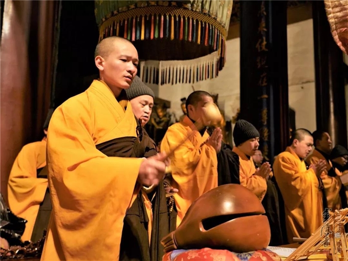 引磬音落,木鱼声起。众僧齐诵《金光明经·空品》,称念"三十三诸天"圣号,后以食色香味,供佛及僧,斋供诸天。