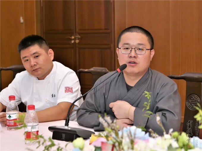 ▲灵隐寺典座圣闻法师 介绍灵隐寺健康膳食运作情况