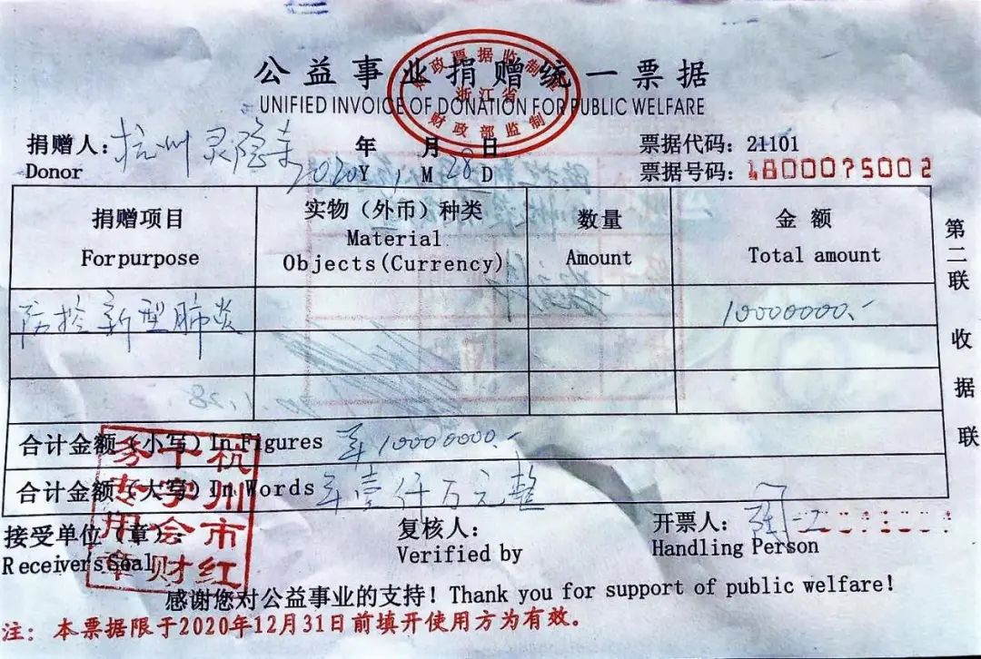 1月28日,灵隐寺向杭州市红十字会捐款一千万元,支援新冠肺炎疫情防控阻击战。