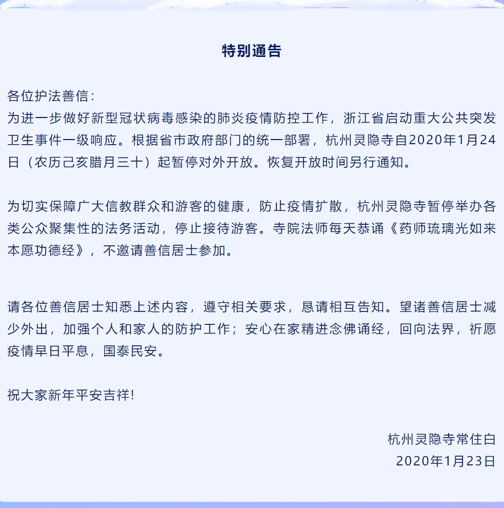 1月23日发布《杭州灵隐寺关于暂停开放的特别通告》,取消2020年新春佛教文化旅游活动,寺院暂停对公众开放,暂停法会等一切集体活动,暂停僧众外出参访参学,僧众和信众培训延迟举行,倡议四众弟子闭关清修、诵经祈福。包括早课、晚课一律暂停,并通过网站、微信、微博等方式发布消息,广而告之,得到广大信众和游客的理解和支持。
