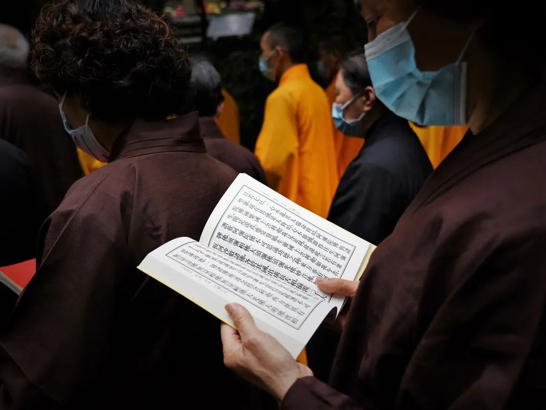 四众众弟子虔诚讽诵大乘经典、梵唱香赞、上供礼拜。法净禅寺监院镇山法师拈香主法。