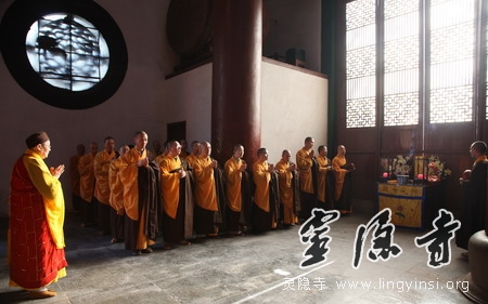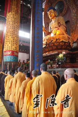 当日下午,灵隐寺百余清净僧众借普佛之际,在我寺大雄宝殿为邵市长举行往生超荐法会,缅怀这位生前曾经给予杭州佛教发展以关心和大力支持的好市长。法会由我寺老典座觉性法师主法,随着鼓声的响起,老和尚亲拈梵香,向庄严慈悲的本师释迦牟尼佛上香顶礼,大众法师齐声诵念往生经文,并将此功德,回向给法界一切有情无情众生,祈求十方三世诸佛菩萨加持,阿弥陀佛接引,往生西方,荣登莲位,安享极乐。