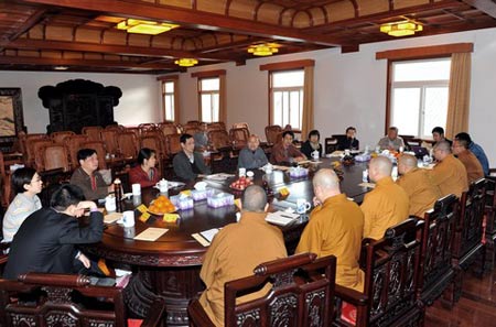 2013年3月12日下午,杭州市民宗局党组书记杨志刚,杭州市佛教协会会长、我寺方丈光泉法师等一行11人到普陀山佛教协会访问。受到普陀山佛教协会驻会副会长兼秘书长门肃法师的热情欢迎,双方就当前佛教制度建设等问题座谈交流。