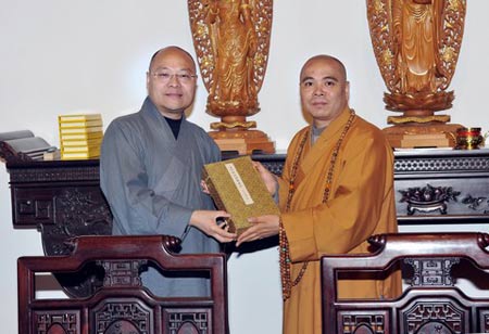 座谈会结束后,光泉法师和门肃法师分别代表杭州市佛教协会与普陀山佛教协会,互赠礼品,并合影留念。参加座谈的还有普陀山佛协常务理事、财务办主任定明法师,副秘书长、普陀山佛协办主任真常法师,副秘书长、教务办主任续圣法师,弘法办副主任正进法师,总务基建办主任助理陈传道,综治办主任助理演通法师。