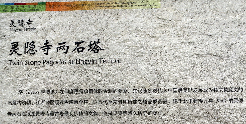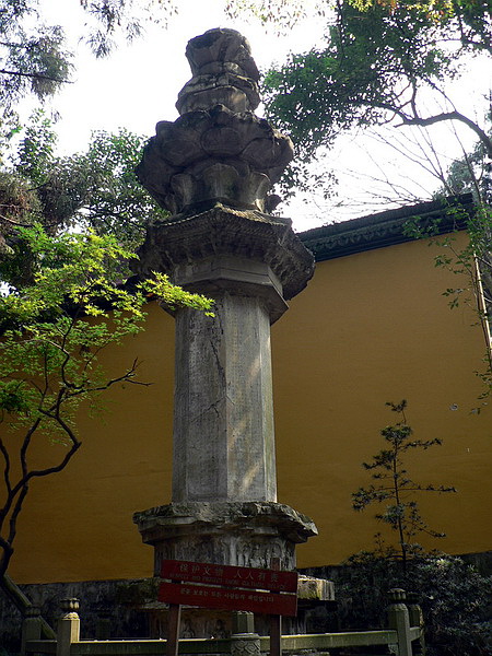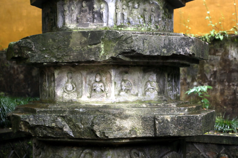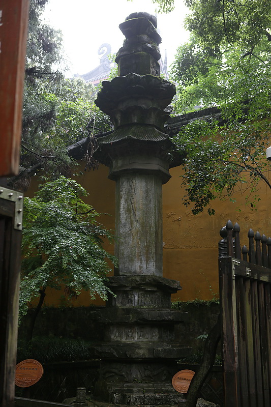 进了寺庙,往大雄宝殿走,到了大殿前,往左右两边看,一东一西各有一座石塔,那就是了。石塔挺拔秀丽,细看的话,塔身上雕刻了140多尊佛教造像。两石塔始建于北宋建隆元年(公元960年),系钱弘俶重建灵隐寺时而立,当时立塔四,今唯存大雄宝殿前东西两侧之双塔。两石塔相距42米,皆为八面九层,仿木构楼阁式塔。