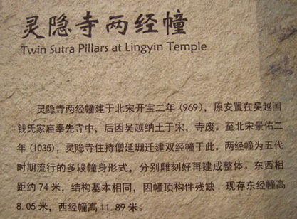 两经幢分别位于天王殿前东西侧,东经幢在灵隐寺进口处(外),西经幢在灵隐寺出口处(内)。据经幢所镌之《建幢记》及附记中所载:经幢由吴越国王建造于北宋开宝二年(969年),原立于钱氏家庙奉先寺,后吴越国纳土于宋,奉先寺毁,乃于景佑二年(1035年)由灵隐寺住持延珊迁建于今址,原为十二层,现已残损,为多层八面形,下部三层须弥座,幢身上刻"随求即得大自在陀罗尼"和"大佛顶陀罗尼"经文。
