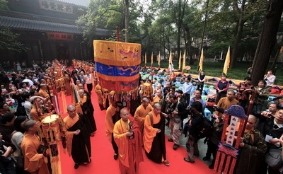 上午8时40分,光泉法师升座法会正式举行,灵隐寺内,一片五彩佛旗的海洋,鲜花簇拥,梵香盈溢,钟鼓齐鸣,嘉宾云集,一派祥瑞庄严的气象。