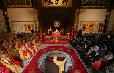出席此次庆典法会的领导有:国家宗教事务局一司副司长裴飚先生,浙江省政协副主席、省委统战部部长汤黎路先生,浙江省委统战部副部长、省民宗委主任王毅先生,浙江省政协民族和宗教委员会主任鲍钢先生、副主任赵一新先生,浙江省政协文教委副主任张国强先生,浙江省民宗委副主任倪忠扬先生、巡视员邢越生先生,中华慈善总会会长范宝俊先生,原浙江省副省长章猛进先生,原浙江省人大民宗侨委主任钟小毛先生,原浙江省政协副主席王务迪先生,原浙江大学党委书记张浚生先生,杭州市副市长张建庭先生,杭州市政协副主席、市委统战部部长董建平先生,杭州市委副秘书长王水法先生,杭州市政府副秘书长刘晓明先生,杭州市人大民宗侨委主任孙远先生,杭州市人大民宗侨委副主任王剑先生,杭州市民族宗教事务局局长钮俊先生,杭州市民族宗教事务局副局长吴建华先生、吴国强先生。
