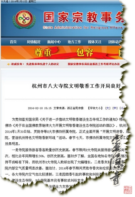 为贯彻落实国宗局《关于进一步推动文明敬香建设生态寺观工作的通知》精神,积极响应中佛协《关于在全国佛教界继续大力开展文明敬香建设生态寺院活动的倡议》,杭州市佛协决定自2014年1月30日始,灵隐寺等8大市佛协所属寺院,正式全面开展"开展文明进香,建设生态寺院,营造杭州特色文明敬香新环境"活动。春节七天,市佛协所属寺院文明敬香工作开局良好,效果明显。
