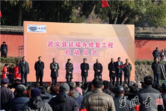 上午9时,浙江省民宗委副主任倪忠扬,浙江省文物局副局长吴志强,灵隐寺方丈光泉大和尚,武义县委副书记、县长张新宇,武义县人大常委会主任徐华良,武义县政协主席骆瑞生,金华市民宗局副局长鲍伟娟,金华市文物局副局长梁成华,武义县委副书记何俊有,武义县人民政府副县长邓小章、李杨勇,武义县政协副主席应慧英等领导和嘉宾出席奠基仪式,现场各界善信近千余人共同见证了唐代古刹延福寺修复工程的正式启动。