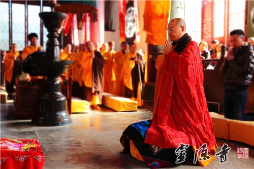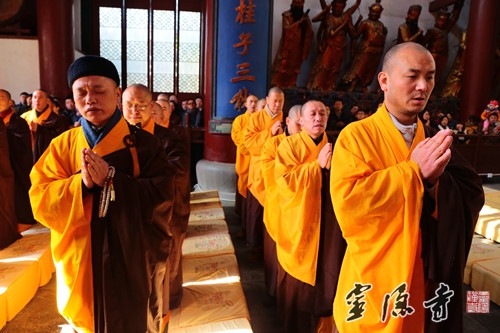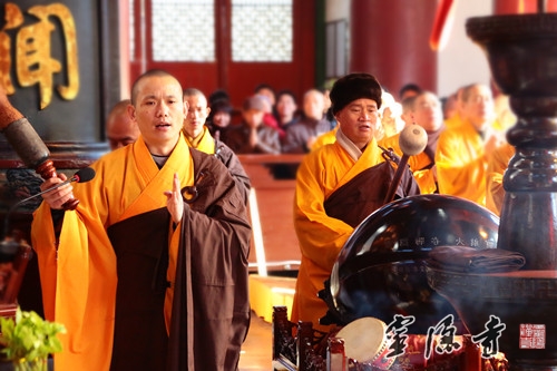 法会现场梵呗高唱,大众恭敬信受,来自各地的香客信众纷纷驻足观礼,在庄严的法会中,聆听方丈和尚开示,共同为"上海外滩踩踏事件"中伤亡同胞默默回向,愿伤者早日康复,亡者安息,并同心同愿,祈福新年。