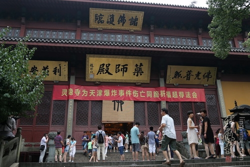 灵隐寺于今天上午在药师殿举行了隆重的"为天津爆炸事故伤亡同胞祈福超荐法会",两序大众和正在参加华严法会的居士信众以及现场的游人香客,共同虔诚礼佛诵经,超荐罹难,祈请诸佛菩萨大悲愿力加持伤亡同胞及救灾人员,祈愿受伤者平安吉祥、逝者早日往生极乐世界,并祈愿菩萨保佑有更多的生命奇迹出现。