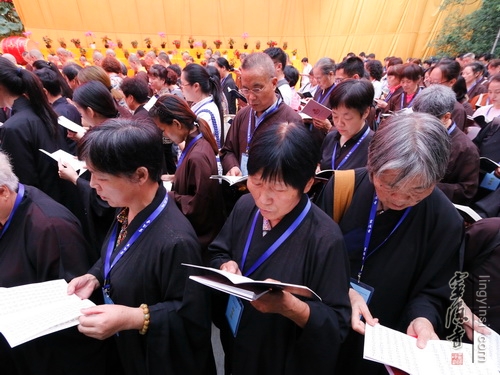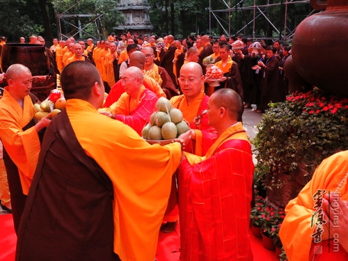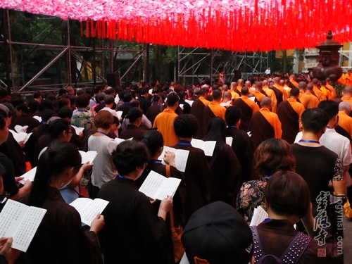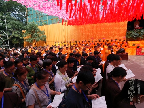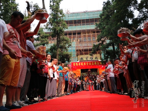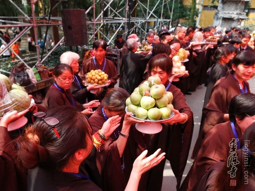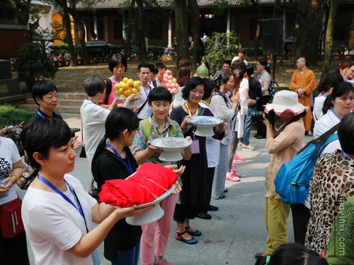 在法师们的引领下,居士信众们一起在大雄宝殿前列队合十,虔诚诵念《盂兰盆经》一小时,超度我及众生的父母六亲,梵音嘹亮,四众清凉。上午九点,穿着僧衣的法师,披着海青的居士,随喜的善信,近两百人的传供队伍排列整齐,共同参加了传供法会。在声声佛号中,香花果品,百味饮食,香油锭烛,尽世甘美,一应供养器物,由僧俗弟子高举过额,顶礼传送到佛前。场面隆重,神圣庄严,四众及游人香客同沾法喜。来自全省各地的2015浙江孝人物们也在现场观礼,因缘殊胜,许多人由此结下了一份难得的佛缘。